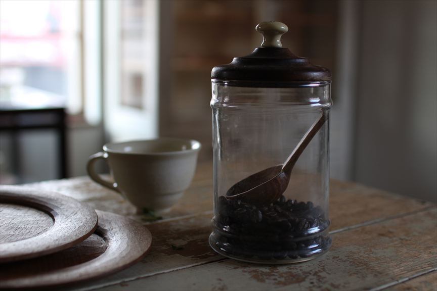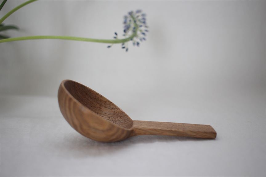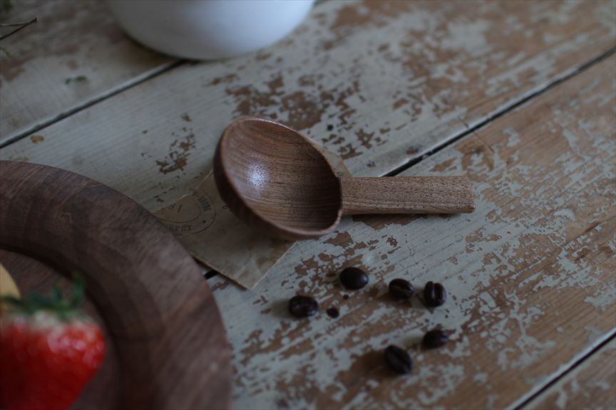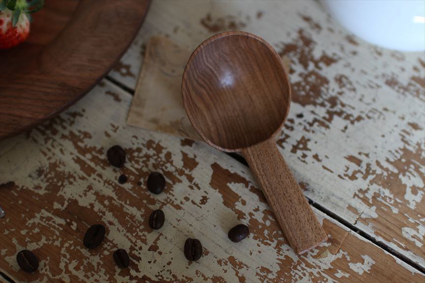 素材の木の持つ自然な色と杢目。平たい持ち手がかわいいコーヒーメジャー。