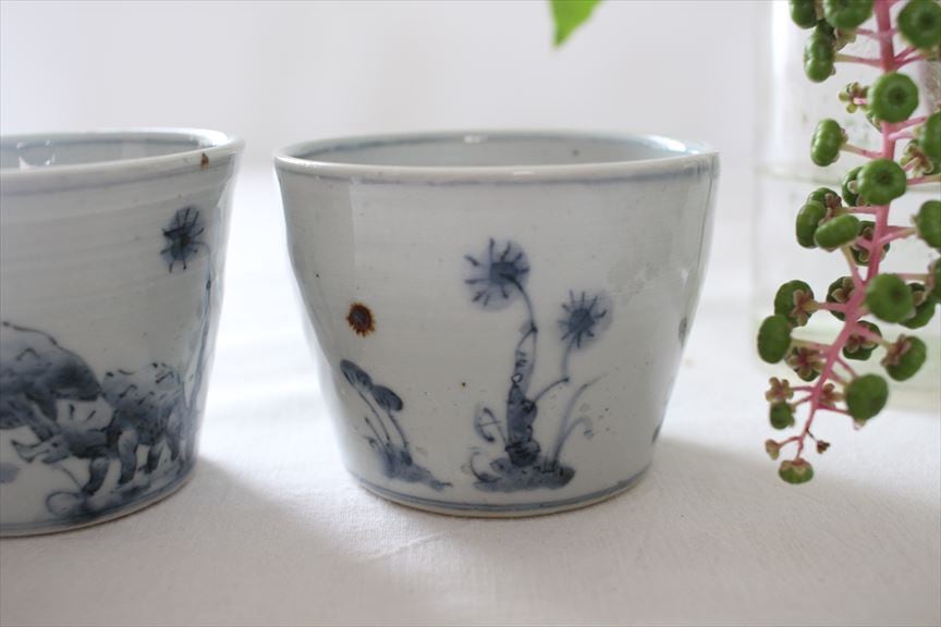 古伊万里のような優し気な古典柄のそば猪口のようですが、絵柄は可愛い恐竜です。