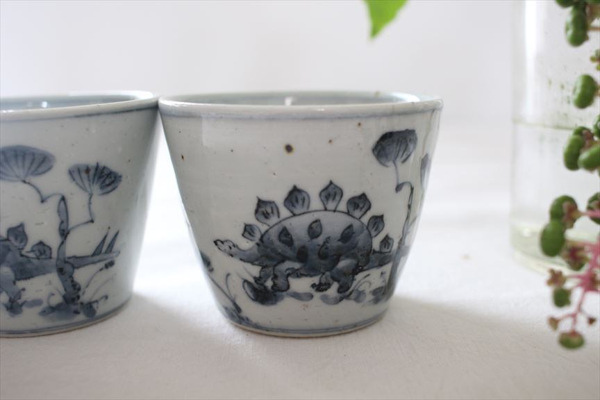 古伊万里のような優し気な古典柄のそば猪口のようですが、絵柄は可愛い恐竜です。
