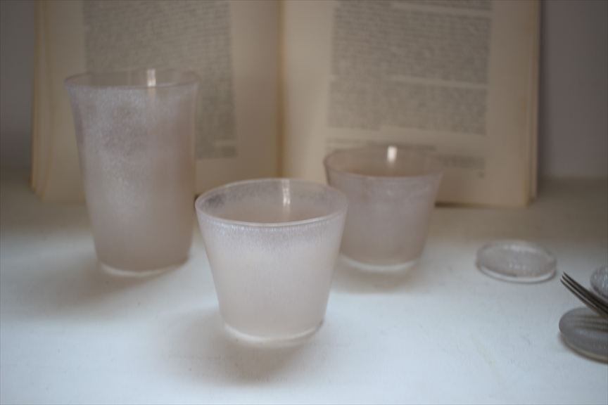 やわらかく、静かに光を透かすガラスの器、ほんのりと霞むような色合いの花器、