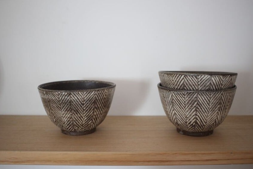 ヘリンボーンの緻密な彫り模様は矢羽根という古典柄でありながら、洗練されたモダンな雰囲気です。