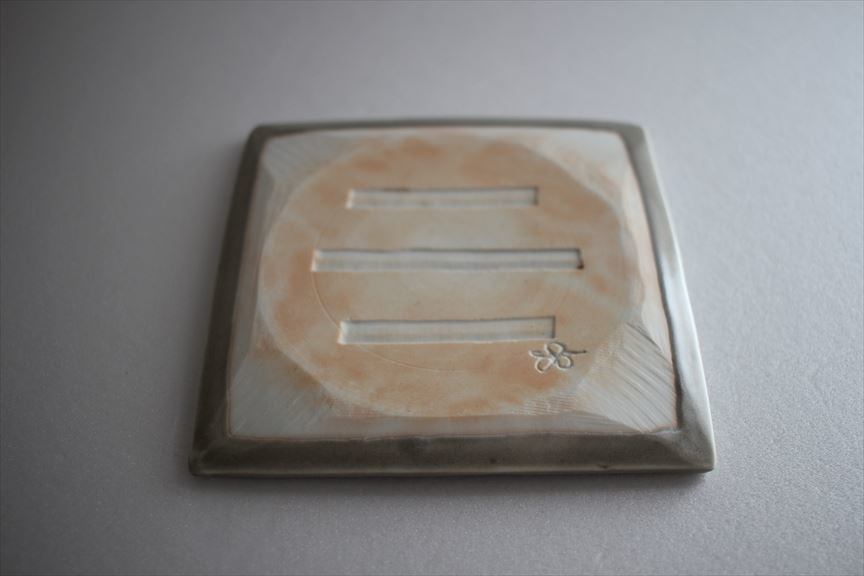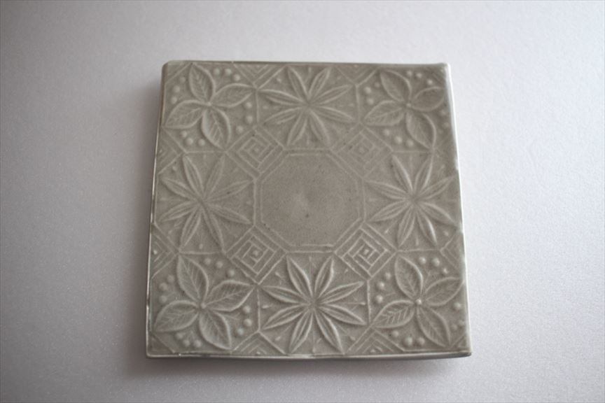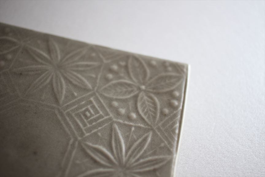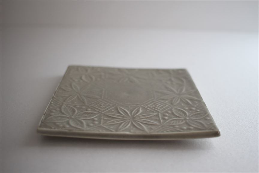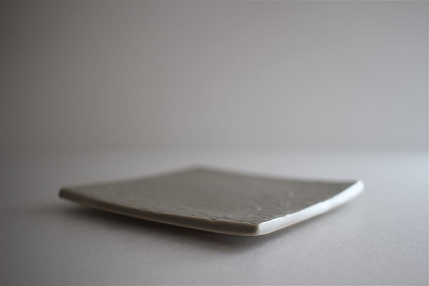 新しい釉薬ネズ釉はよりシンプルなグレーに近い色みです。可愛らしい花模様が浮かび上がります。板皿ですが、持ち上げやすいように端は工夫されています。