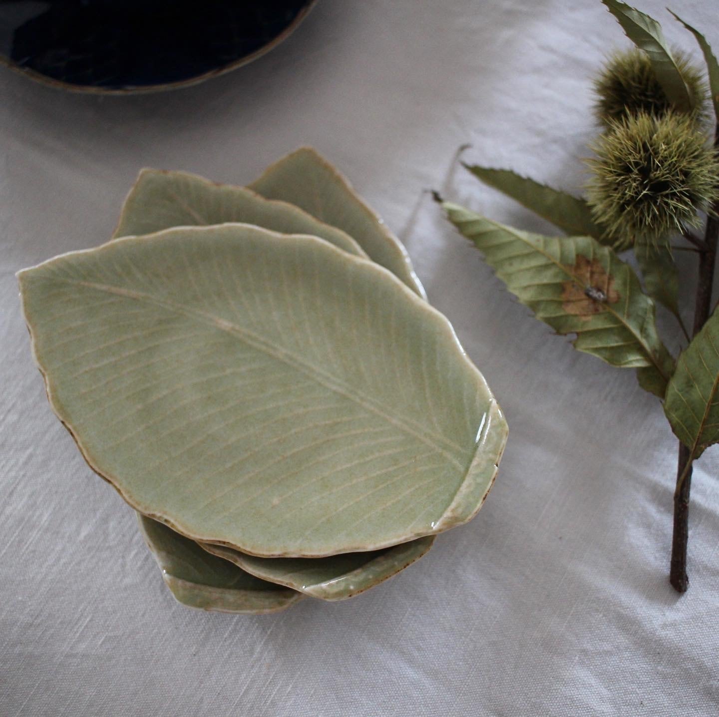 高台があって持ち上げやすいカタチに工夫されています。すっと流れる葉脈が清々しい葉皿です。