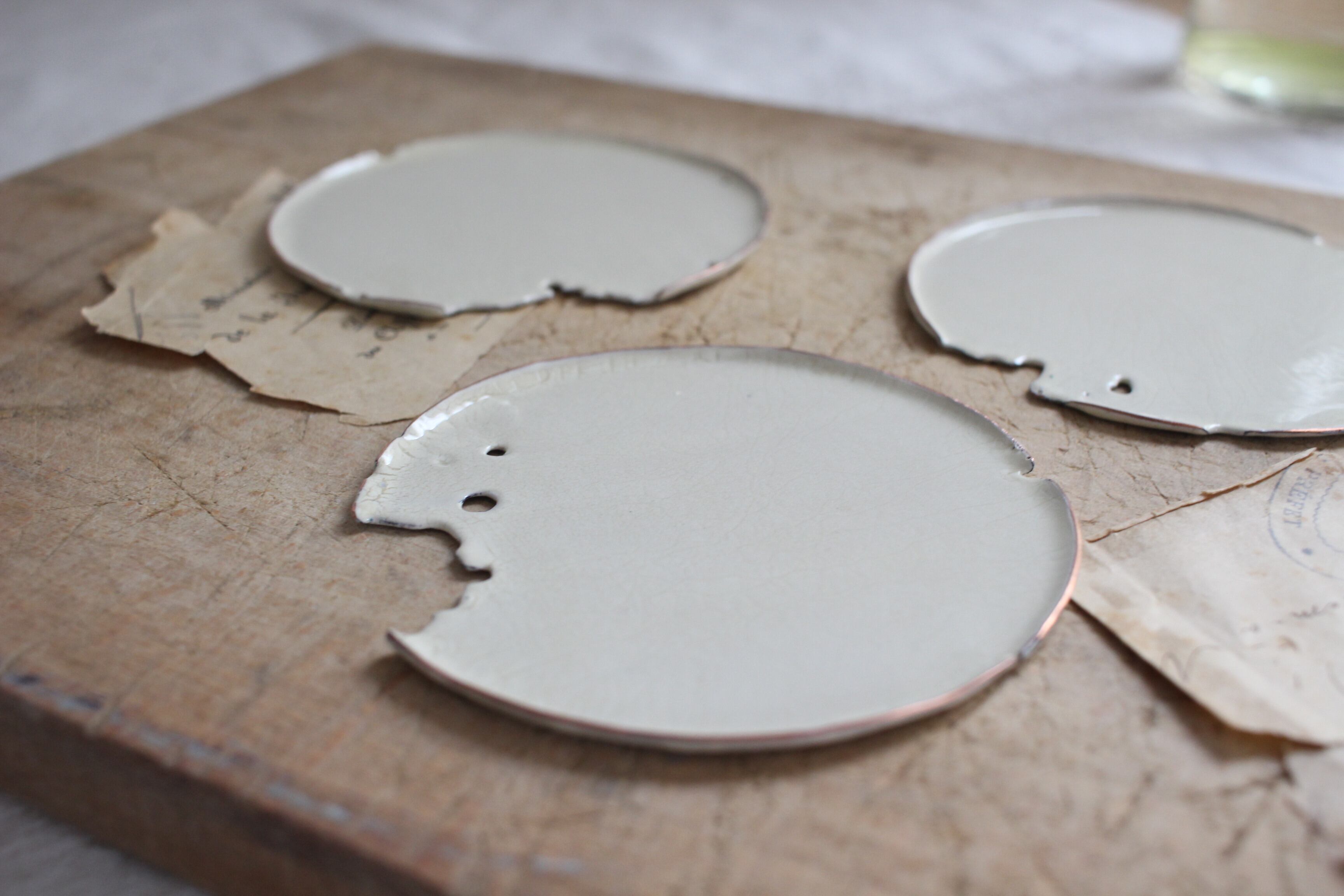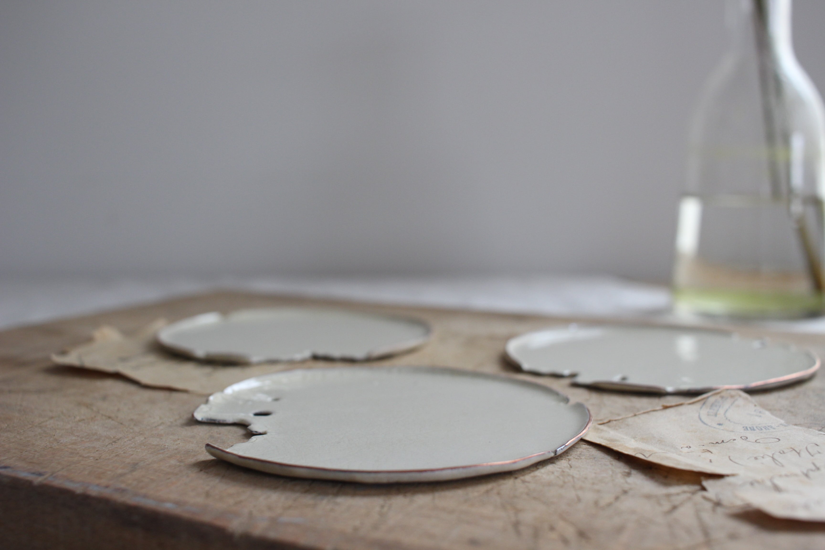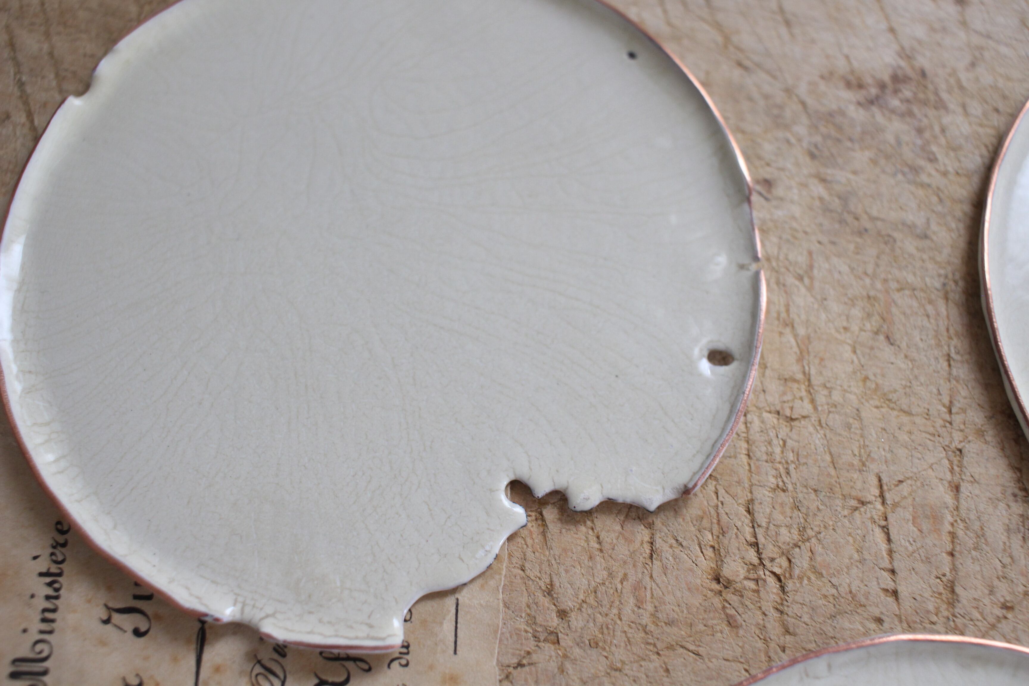 銅ホーローの作品はひとつひとつ手でたたいて成形した銅板の素地に、ガラス質の釉薬を掛けて高温で何度も焼いて作られています。