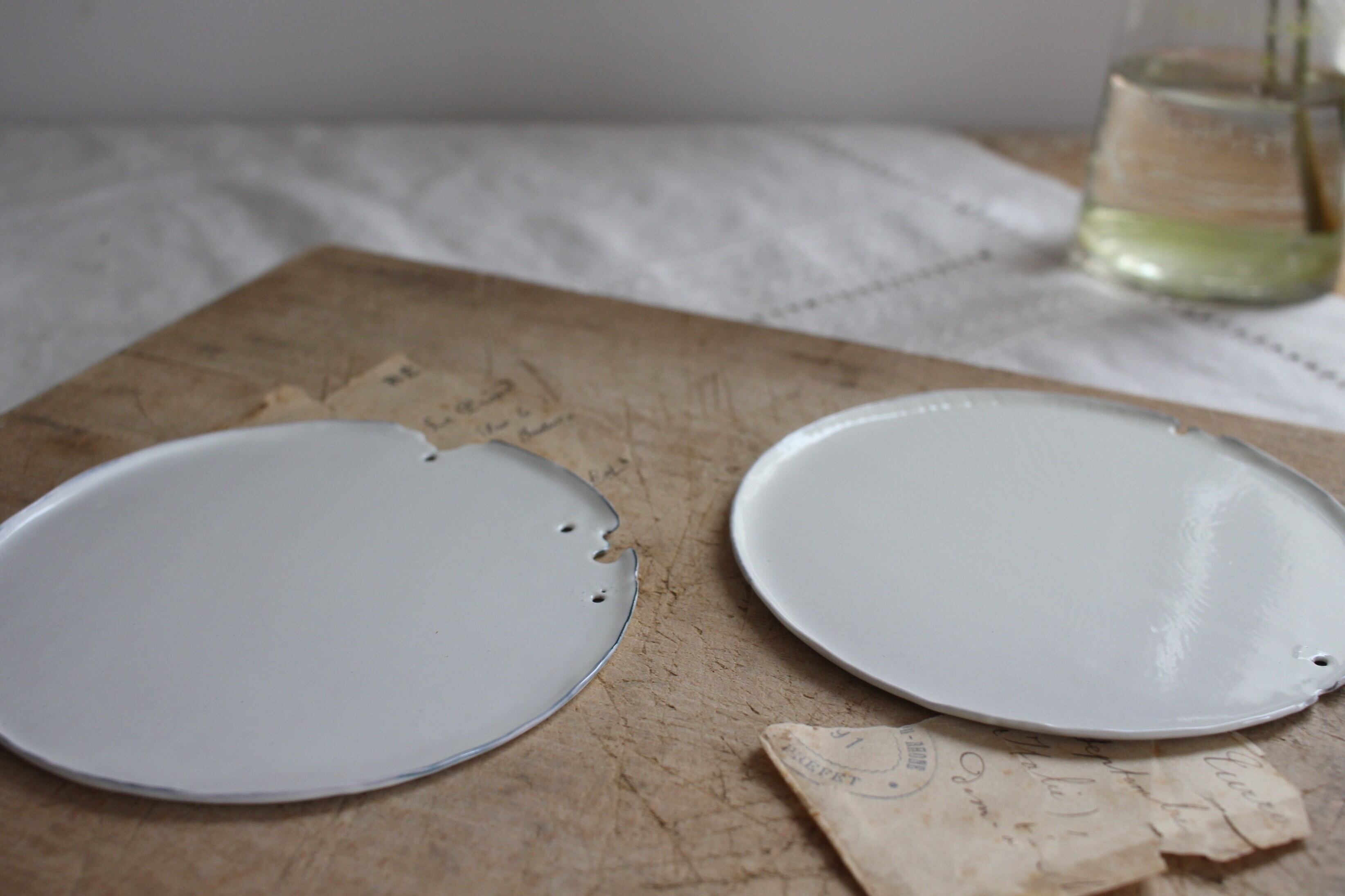銅ホーローの作品はひとつひとつ手でたたいて成形した銅板の素地に、ガラス質の釉薬を掛けて高温で何度も焼いて作られています。