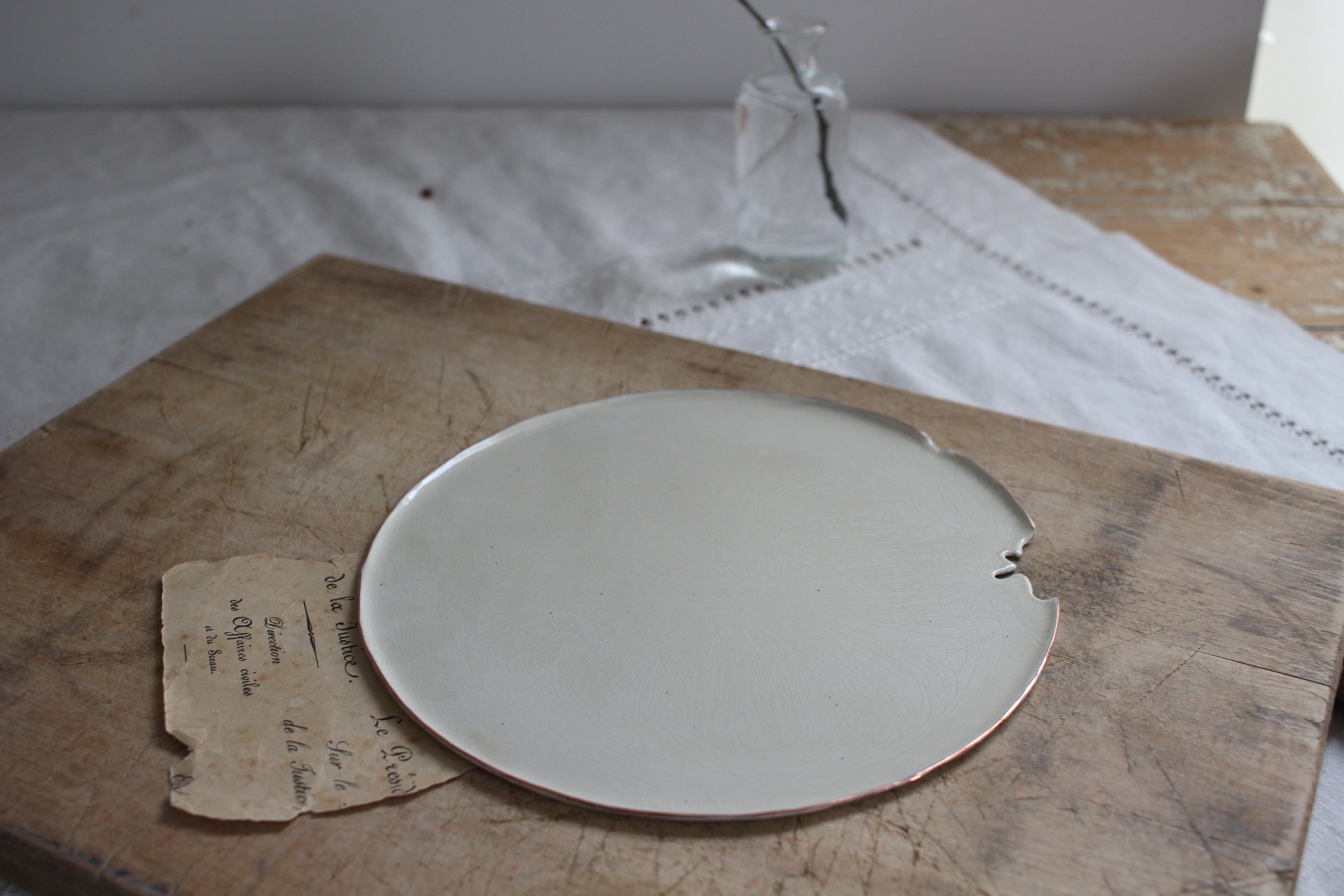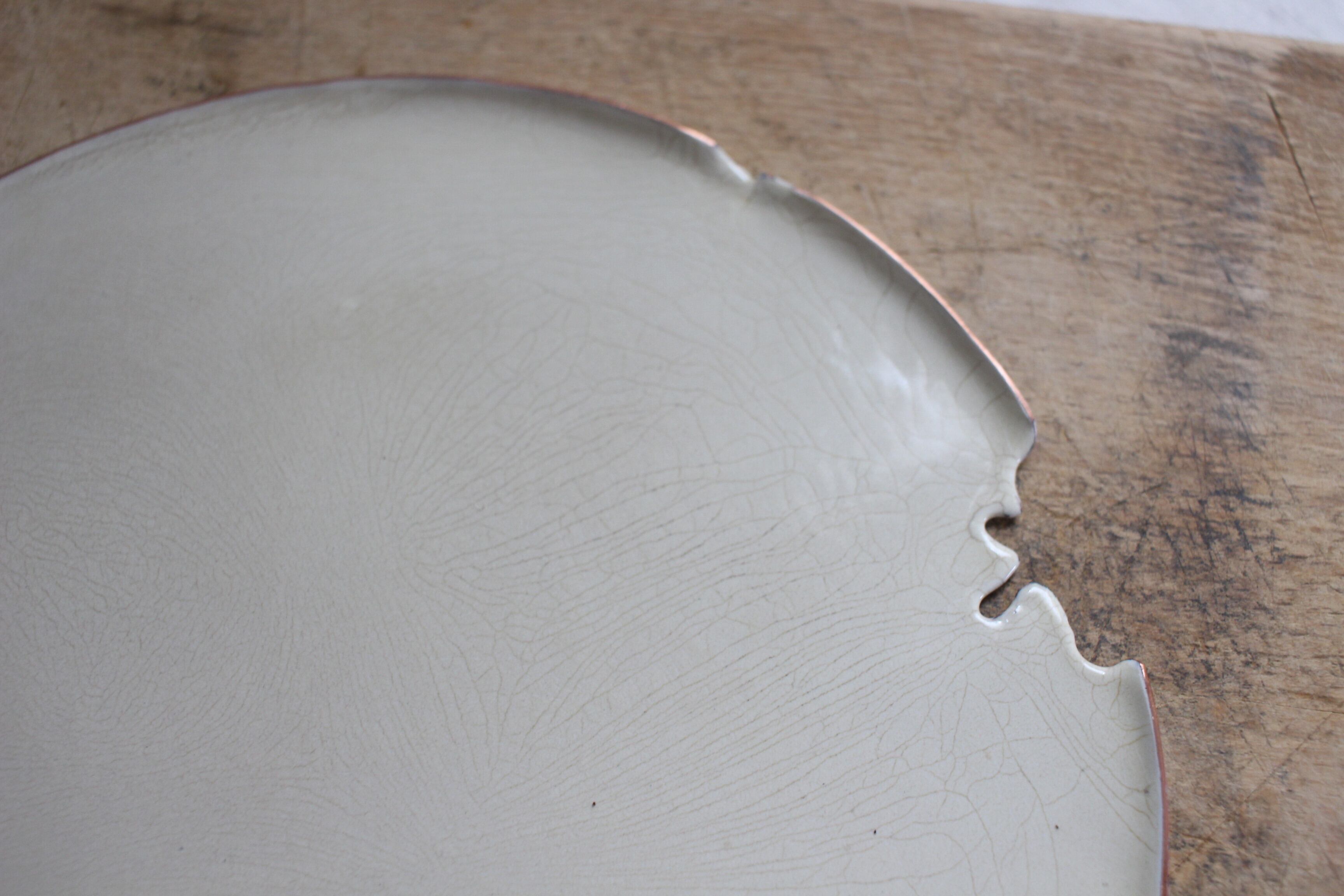 銅ホーローの作品はひとつひとつ手でたたいて成形した銅板の素地に、ガラス質の釉薬を掛けて高温で何度も焼いて作られています。
