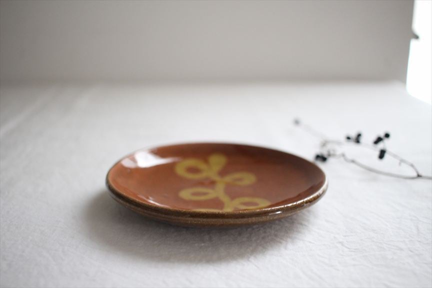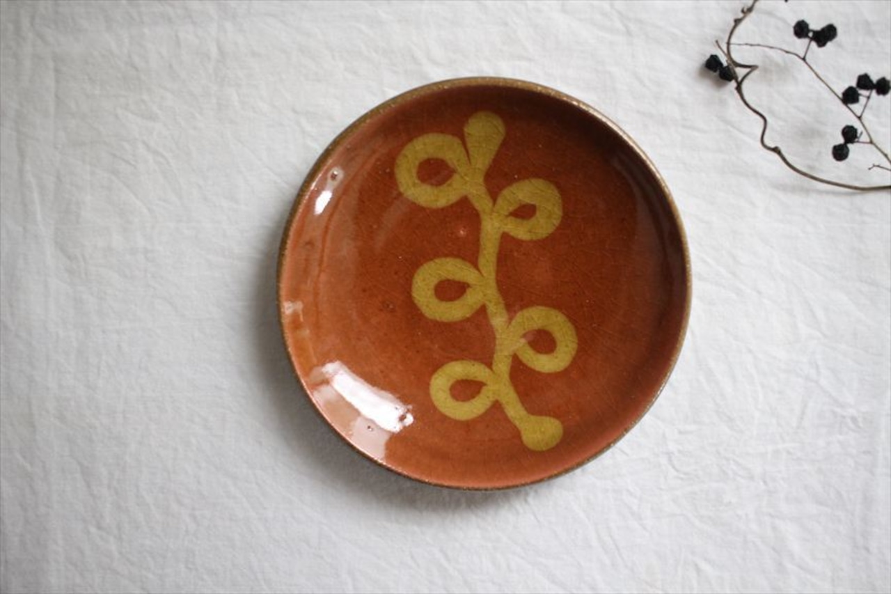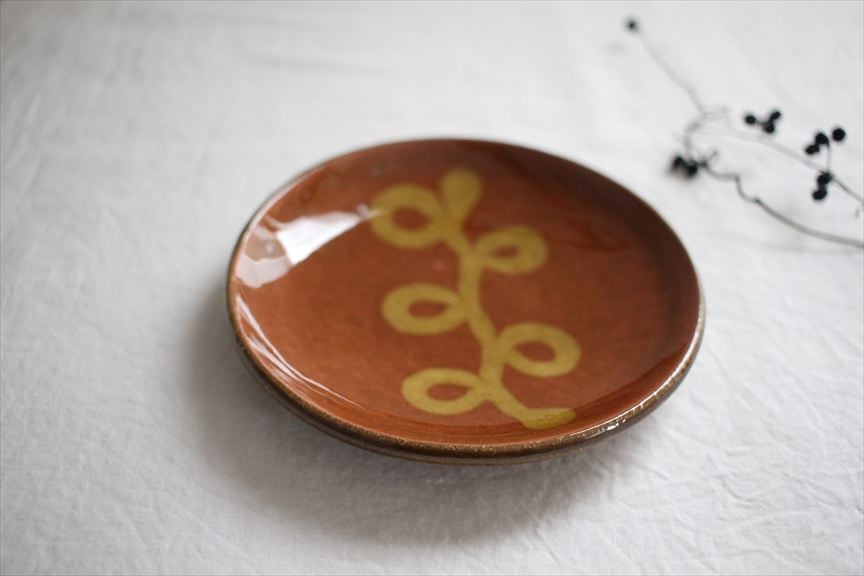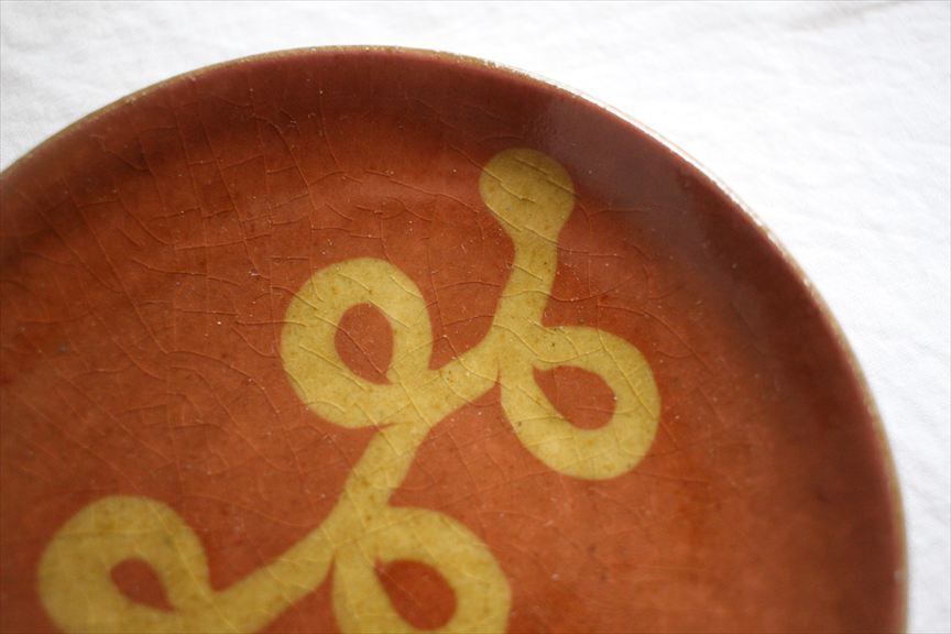 色鮮やかな生地にくねくねくるりんとスリップで描かれた線文様が踊る楽しい器たち。