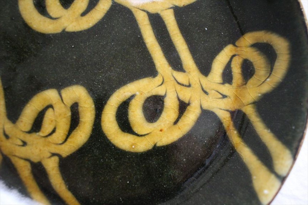 色鮮やかな生地にくねくねくるりんとスリップで描かれた線文様が踊る楽しい器たち。