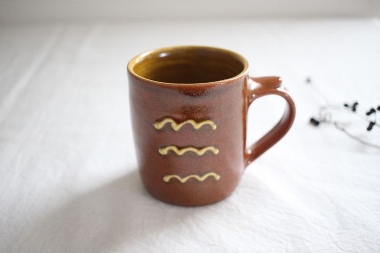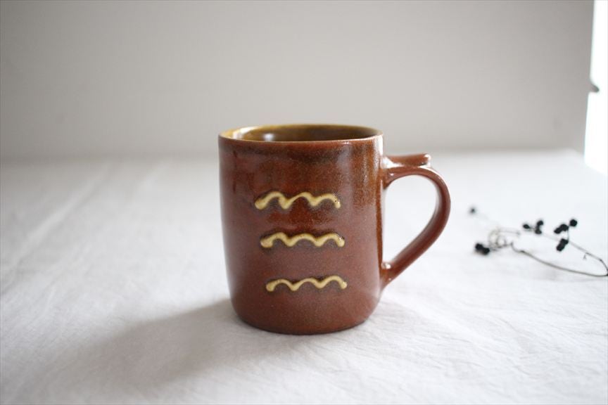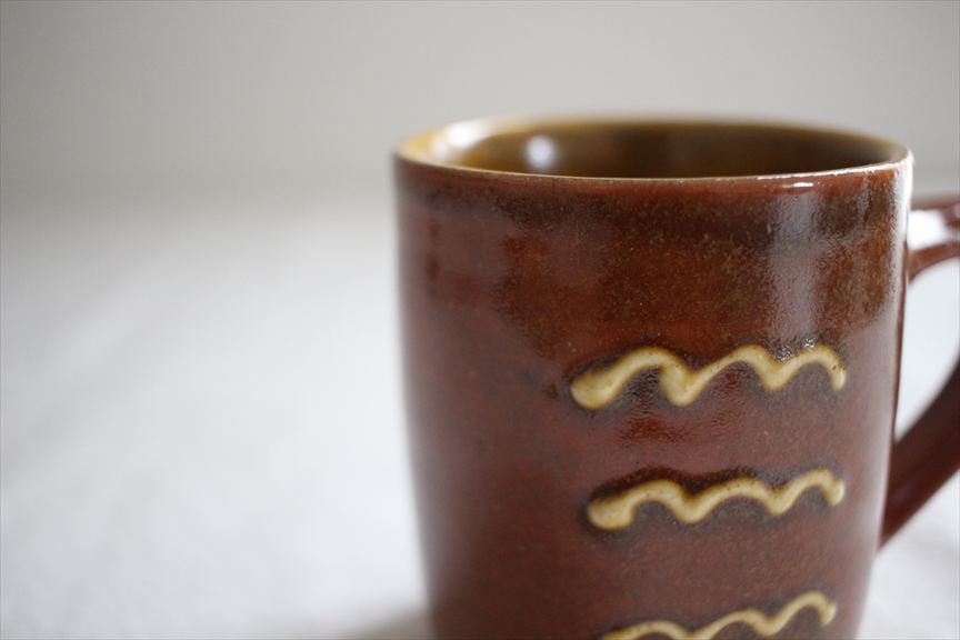 色鮮やかな生地にくねくねくるりんとスリップで描かれた線文様が踊る楽しい器たち。