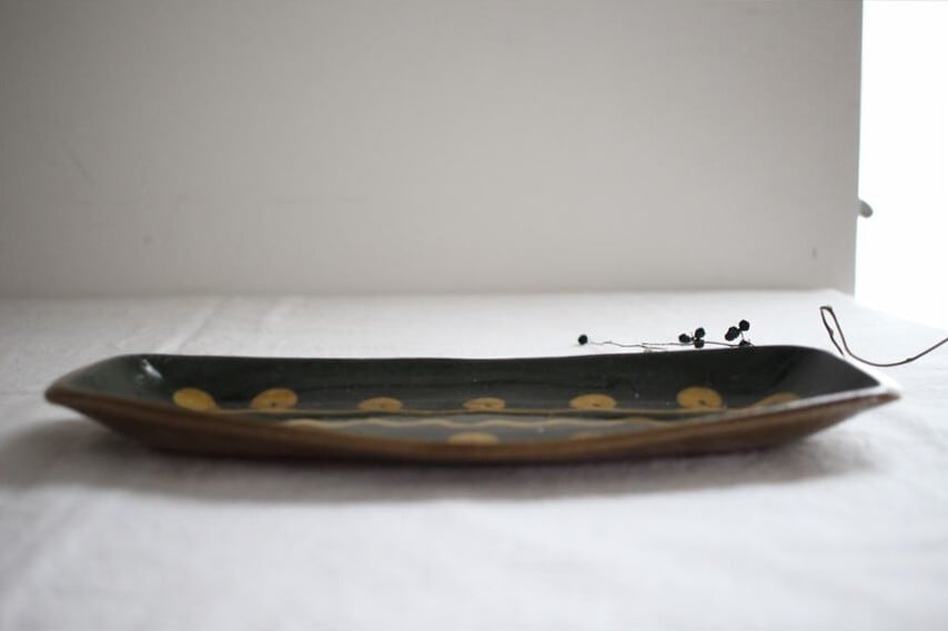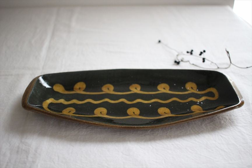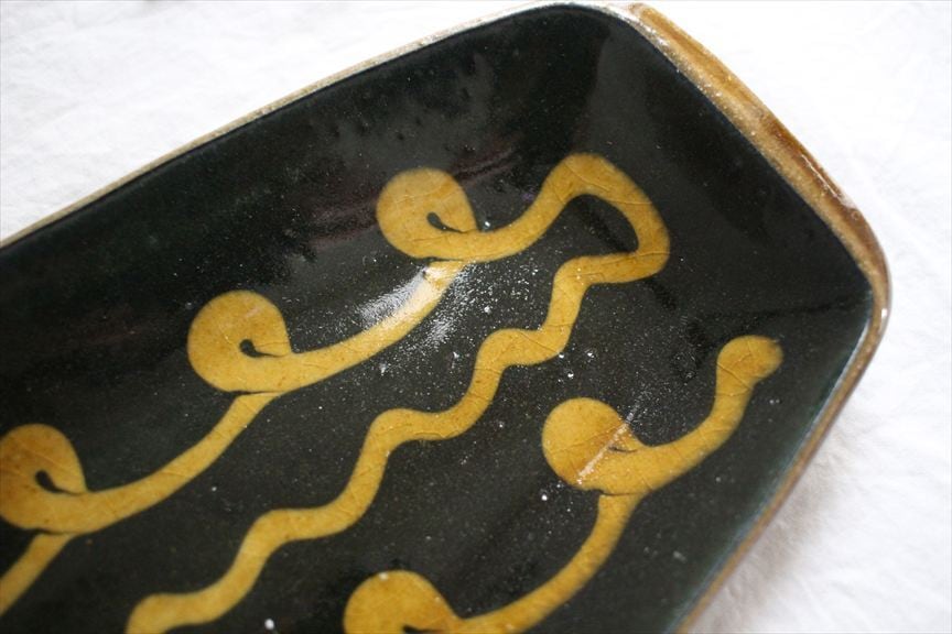 色鮮やかな生地にくねくねくるりんとスリップで描かれた線文様が踊る楽しい器たち。