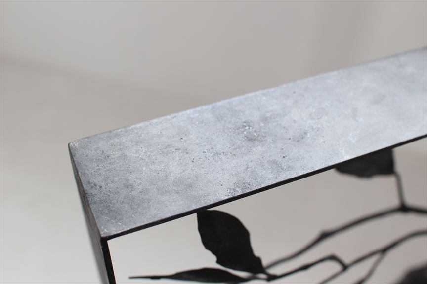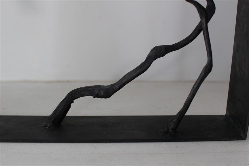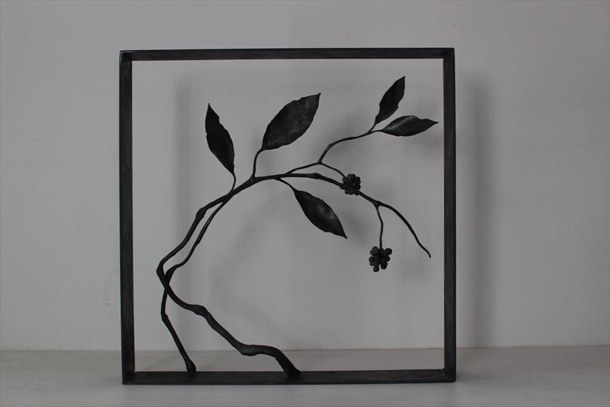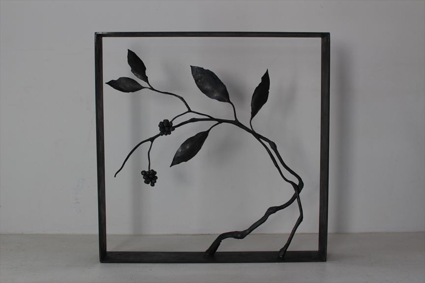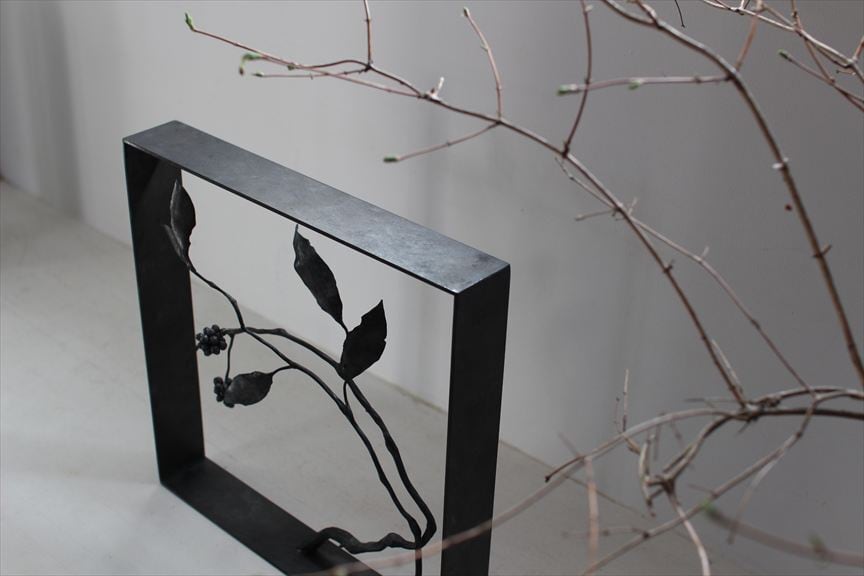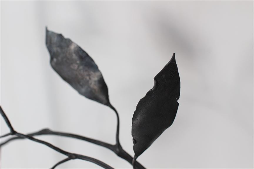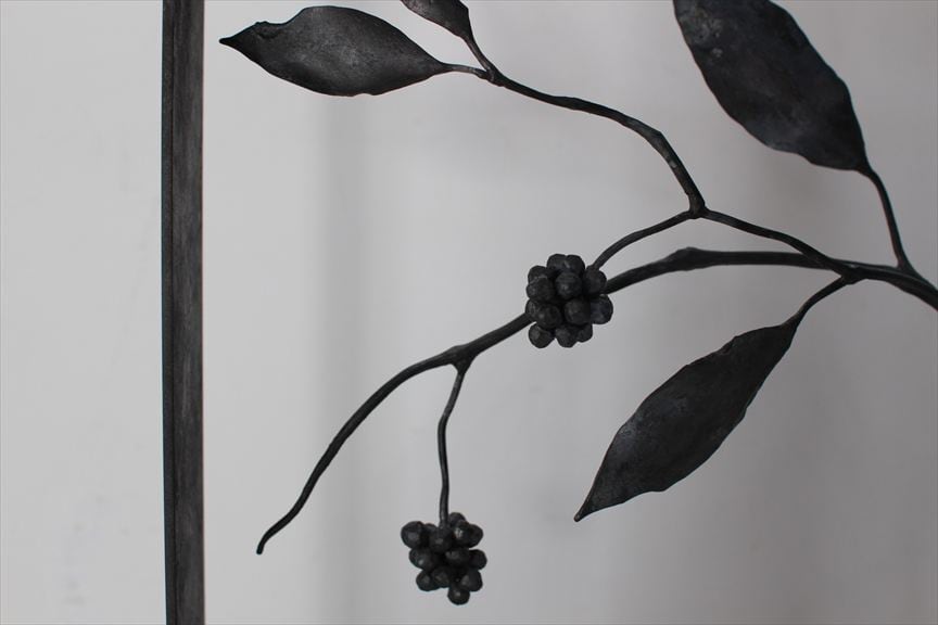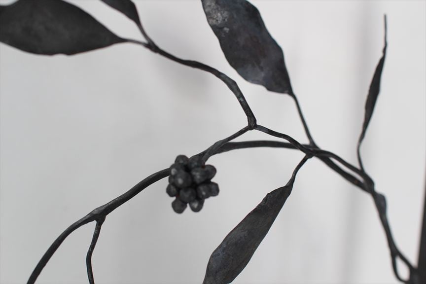 鉄で作られた大きなオブジェ、高く大きな枝を生けることのできる重い鉄の花器、一本の金属の棒をただ叩いて叩いて伸ばし広げ、カトラリーに仕上げたぬくもりのある素朴な作品など、