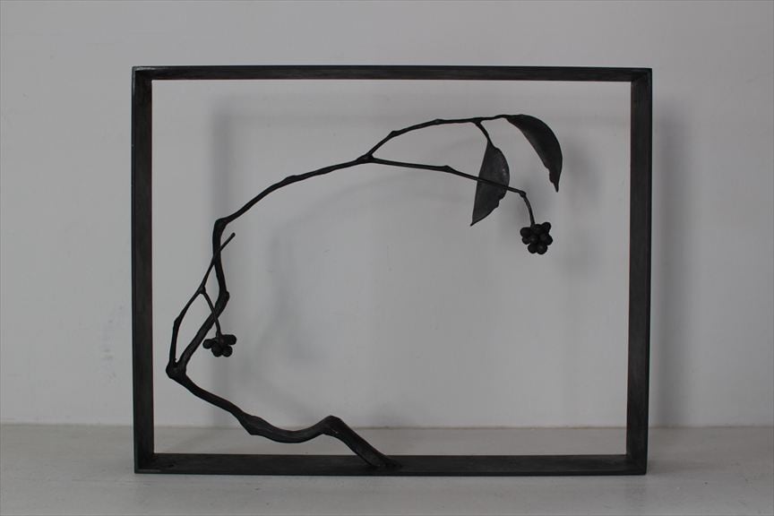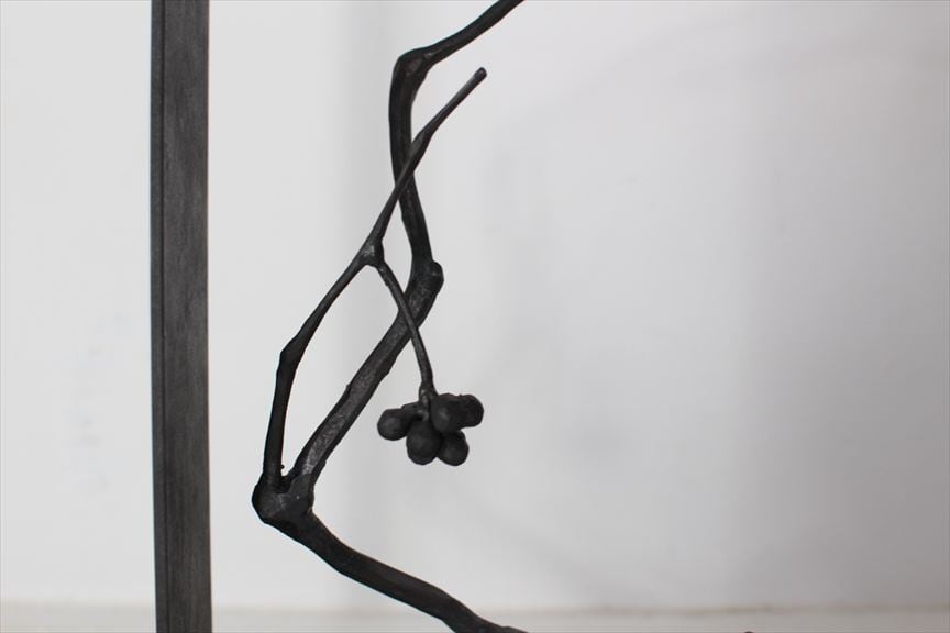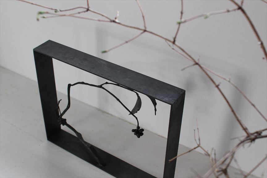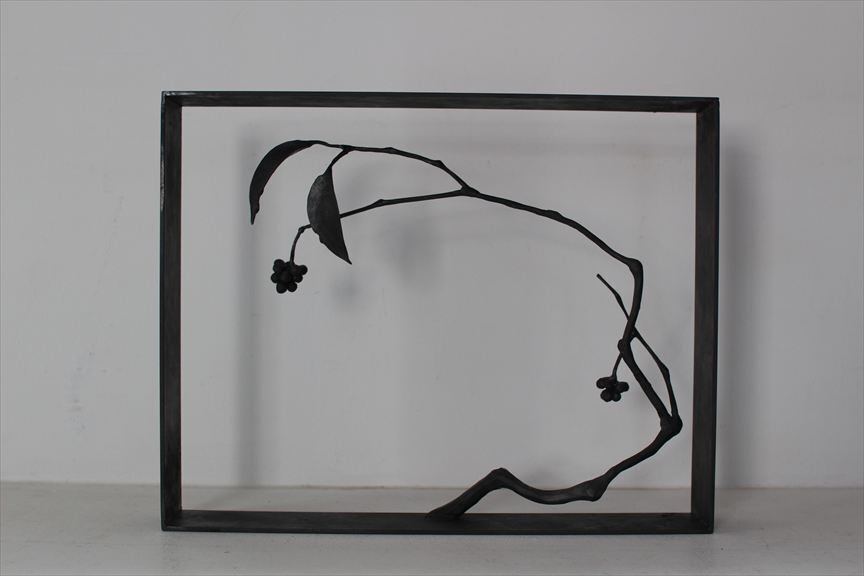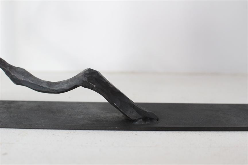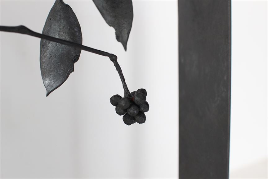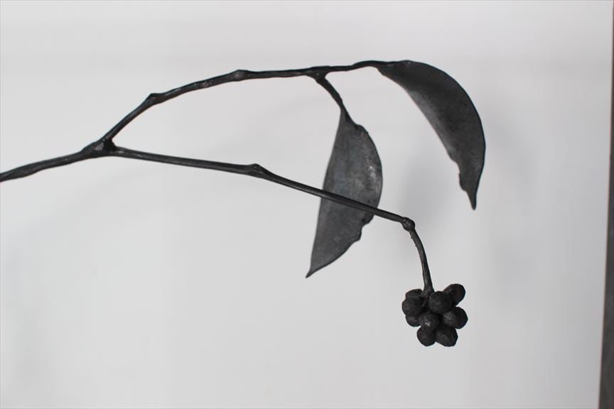 鉄で作られた大きなオブジェ、高く大きな枝を生けることのできる重い鉄の花器、一本の金属の棒をただ叩いて叩いて伸ばし広げ、カトラリーに仕上げたぬくもりのある素朴な作品など、