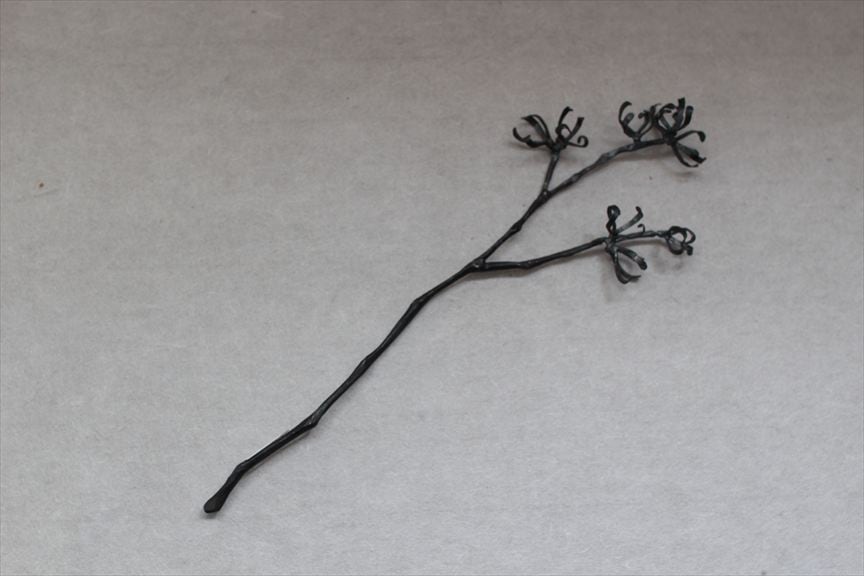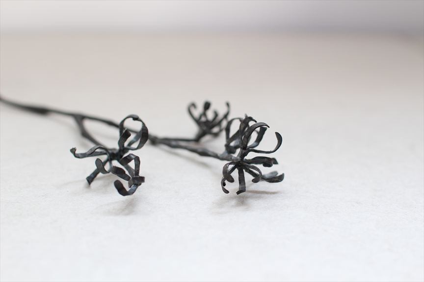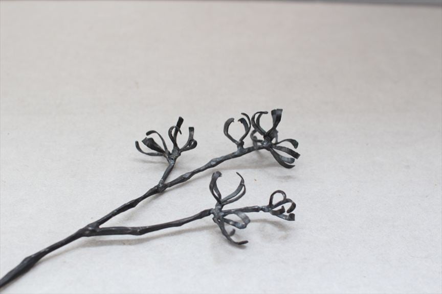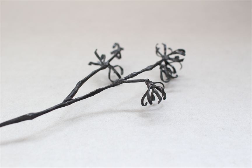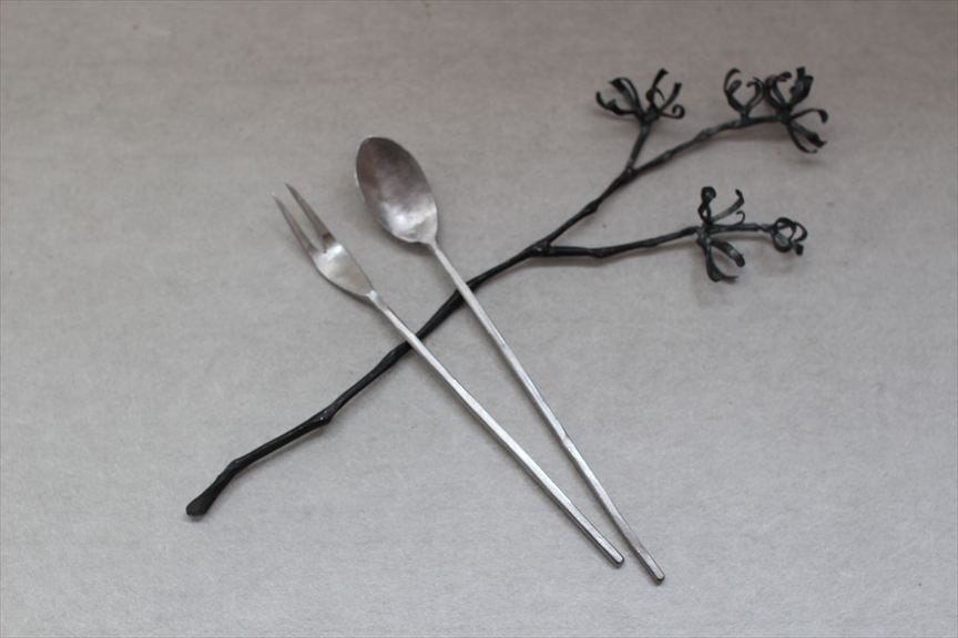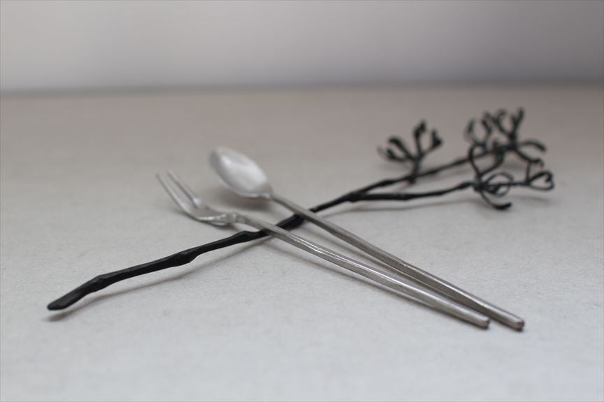 鉄で作られた大きなオブジェ、高く大きな枝を生けることのできる重い鉄の花器、一本の金属の棒をただ叩いて叩いて伸ばし広げ、カトラリーに仕上げたぬくもりのある素朴な作品など、
