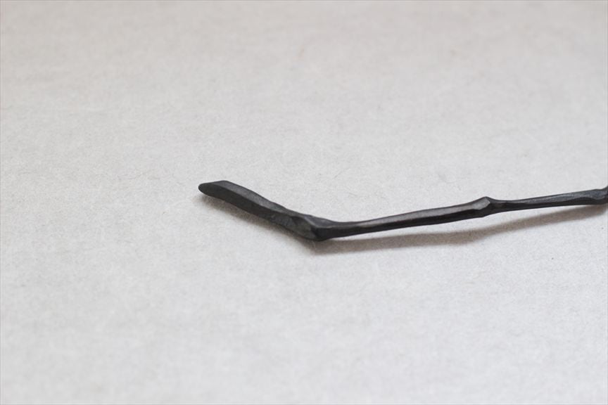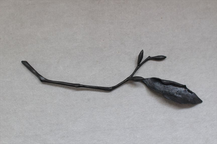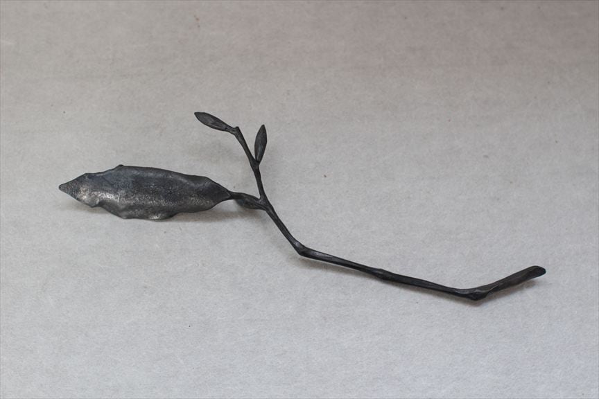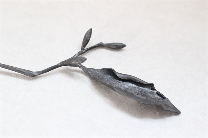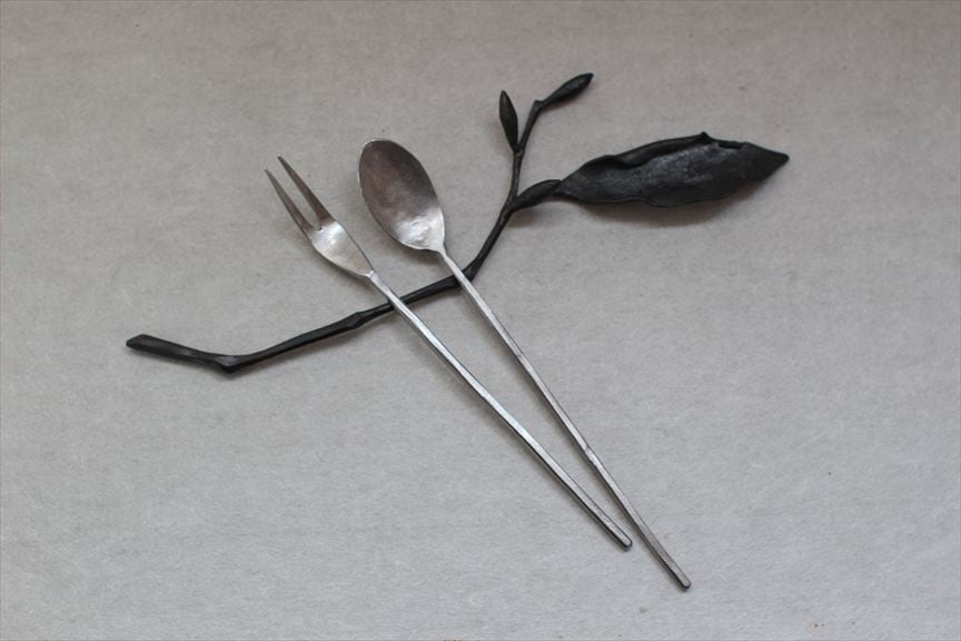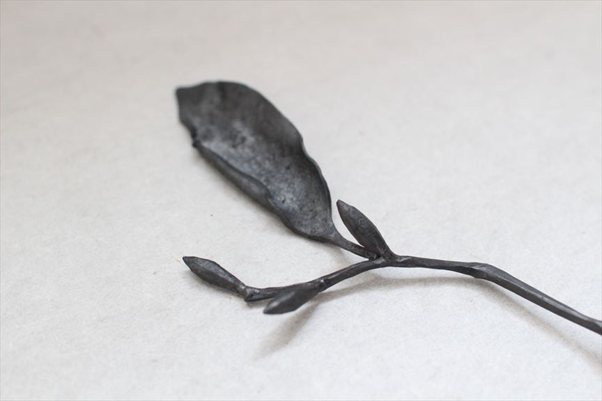 鉄で作られた大きなオブジェ、高く大きな枝を生けることのできる重い鉄の花器、一本の金属の棒をただ叩いて叩いて伸ばし広げ、カトラリーに仕上げたぬくもりのある素朴な作品など、
