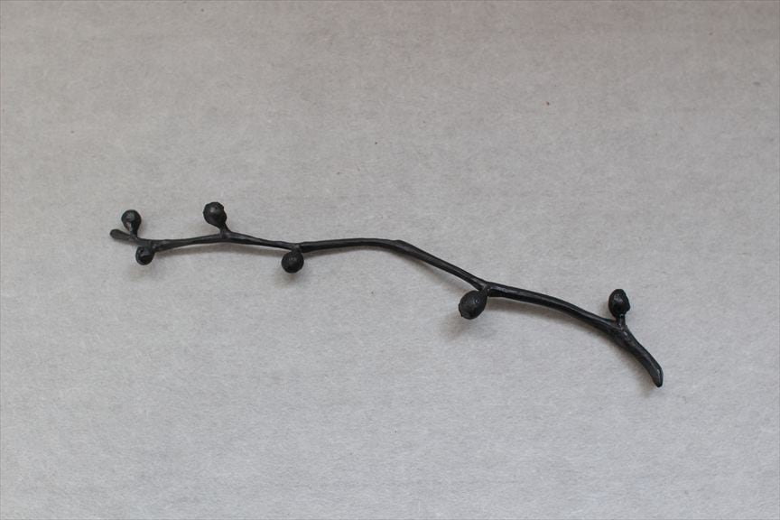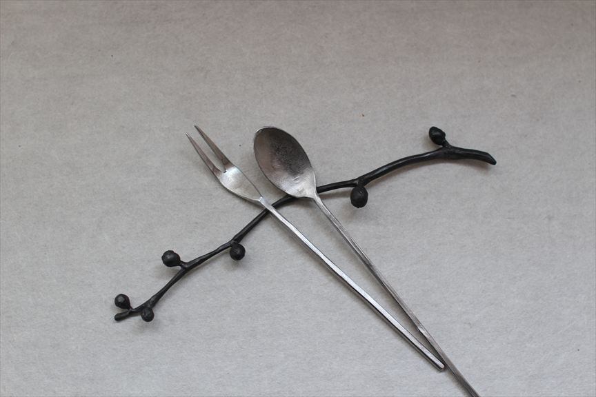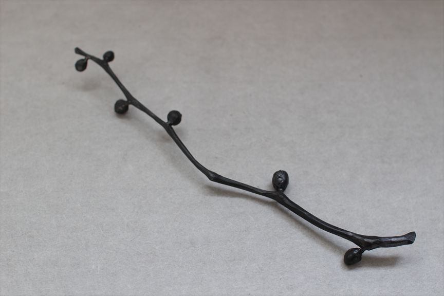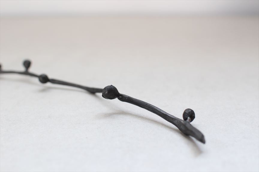 鉄で作られた大きなオブジェ、高く大きな枝を生けることのできる重い鉄の花器、一本の金属の棒をただ叩いて叩いて伸ばし広げ、カトラリーに仕上げたぬくもりのある素朴な作品など、