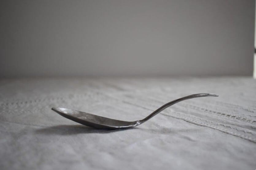 鉄で作られた大きなオブジェ、高く大きな枝を生けることのできる重い鉄の花器、一本の金属の棒をただ叩いて叩いて伸ばし広げ、カトラリーに仕上げたぬくもりのある素朴な作品など、