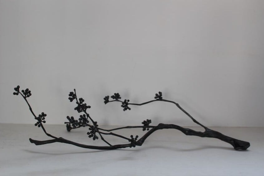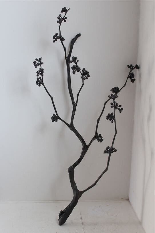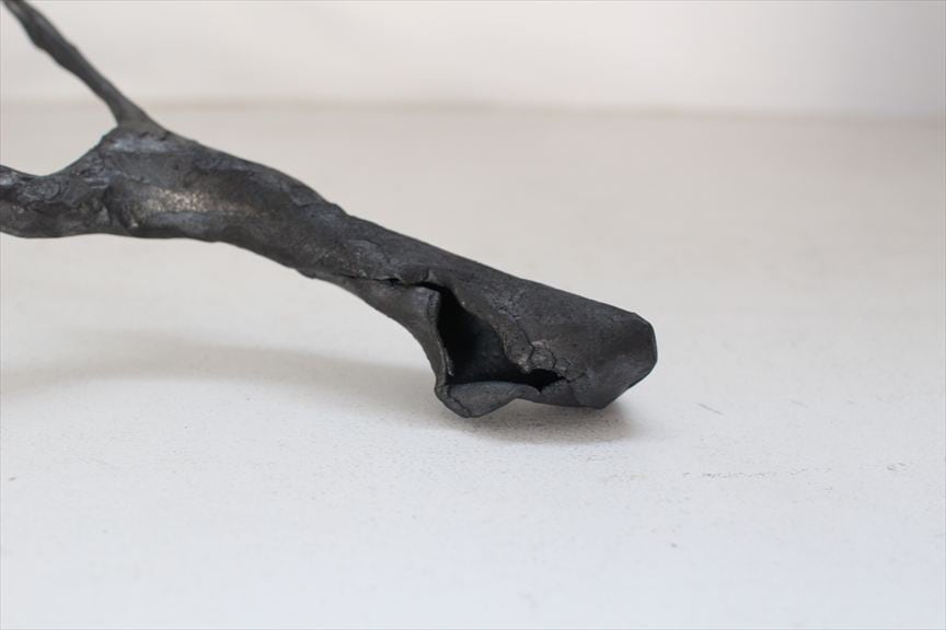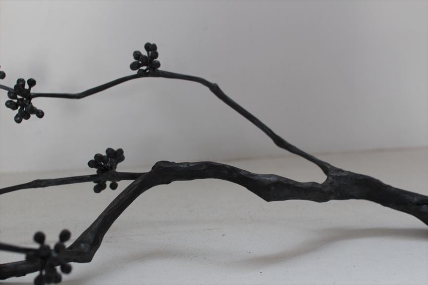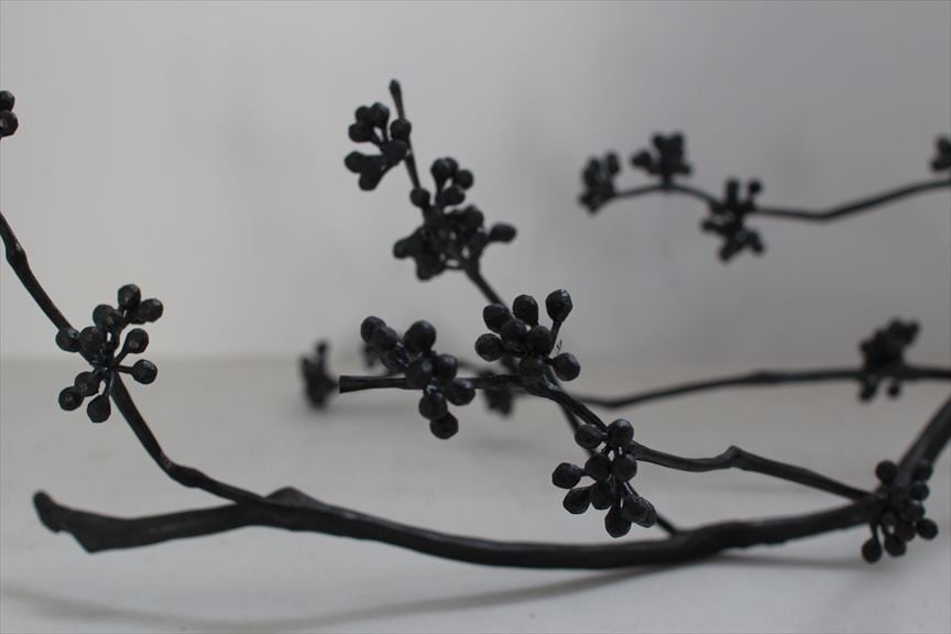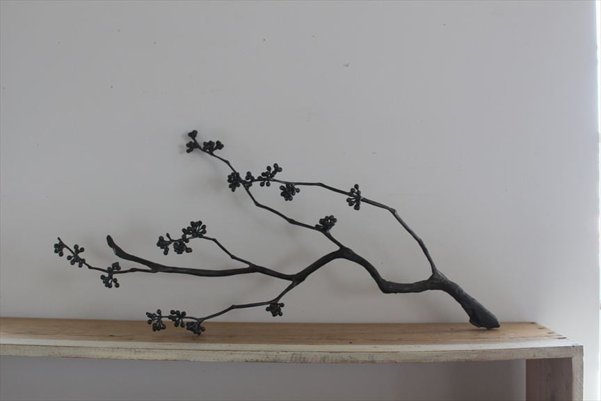 鉄で作られた大きなオブジェ、高く大きな枝を生けることのできる重い鉄の花器、一本の金属の棒をただ叩いて叩いて伸ばし広げ、カトラリーに仕上げたぬくもりのある素朴な作品など、