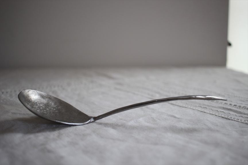 鉄で作られた大きなオブジェ、高く大きな枝を生けることのできる重い鉄の花器、一本の金属の棒をただ叩いて叩いて伸ばし広げ、カトラリーに仕上げたぬくもりのある素朴な作品など、