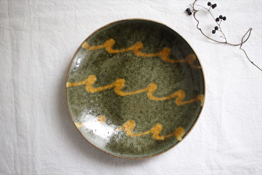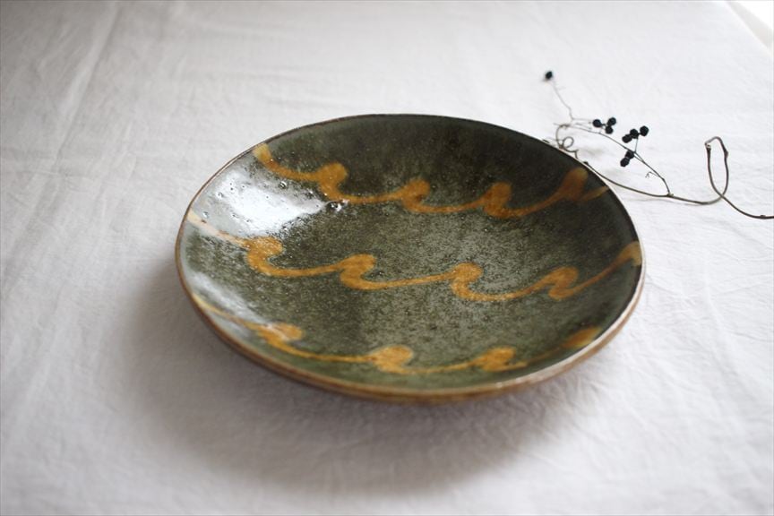 色鮮やかな生地にくねくねくるりんとスリップで描かれた線文様が踊る楽しい器たち。