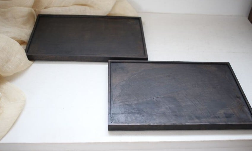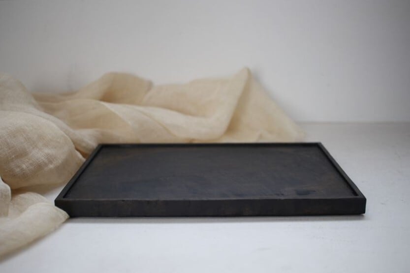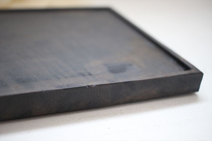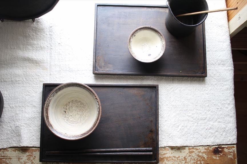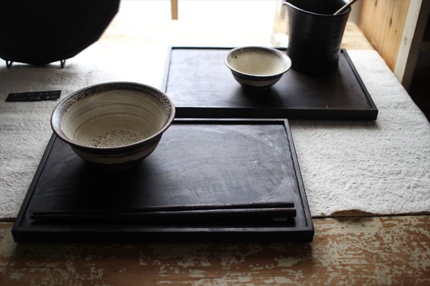 木の持つ粗野で豊かで自然な表情を鉄媒染、黒漆で包み込み、静かで美しい作品に仕上げています。人の呼吸に沿うような落ち着いた佇まい。