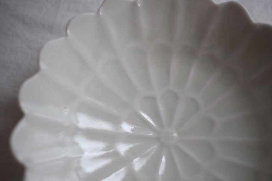 古典的な染付は淡い呉須で可愛らしい印象。また、緻密で繊細なイッチン模様やうつわを縁取る細密な型押しの作品はアンティークレースのように清楚な華やぎ。