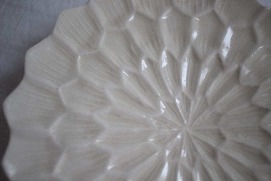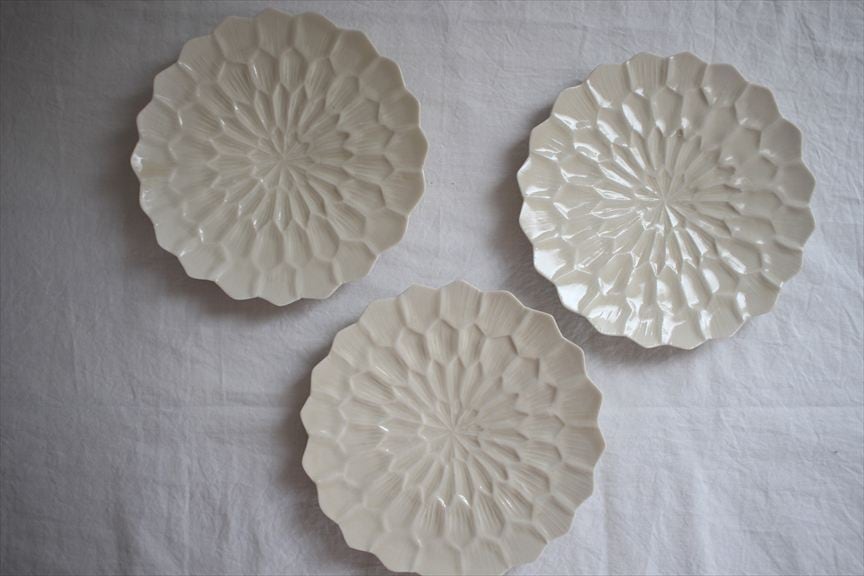 古典的な染付は淡い呉須で可愛らしい印象。また、緻密で繊細なイッチン模様やうつわを縁取る細密な型押しの作品はアンティークレースのように清楚な華やぎ。