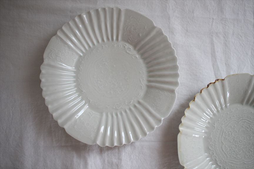 古典的な染付は淡い呉須で可愛らしい印象。また、緻密で繊細なイッチン模様やうつわを縁取る細密な型押しの作品はアンティークレースのように清楚な華やぎ。