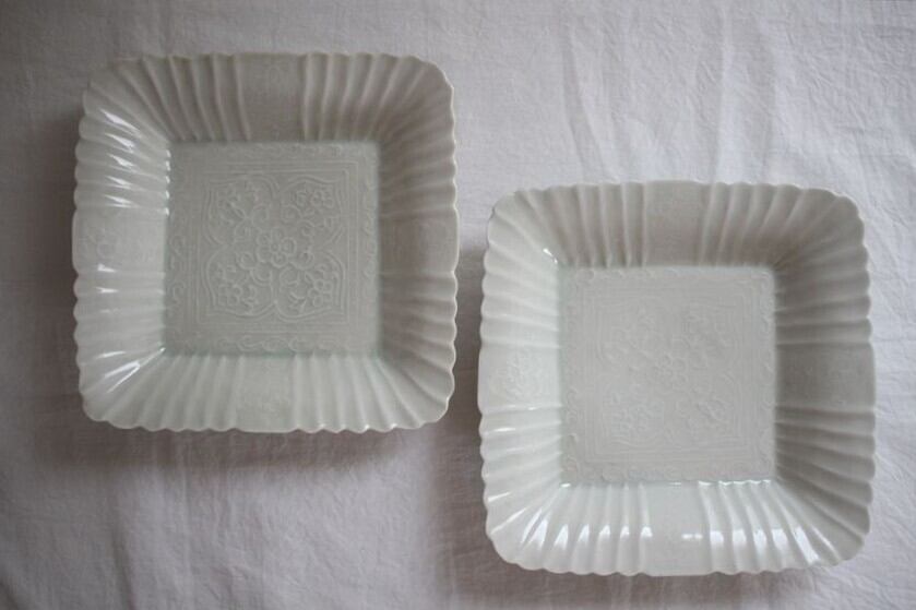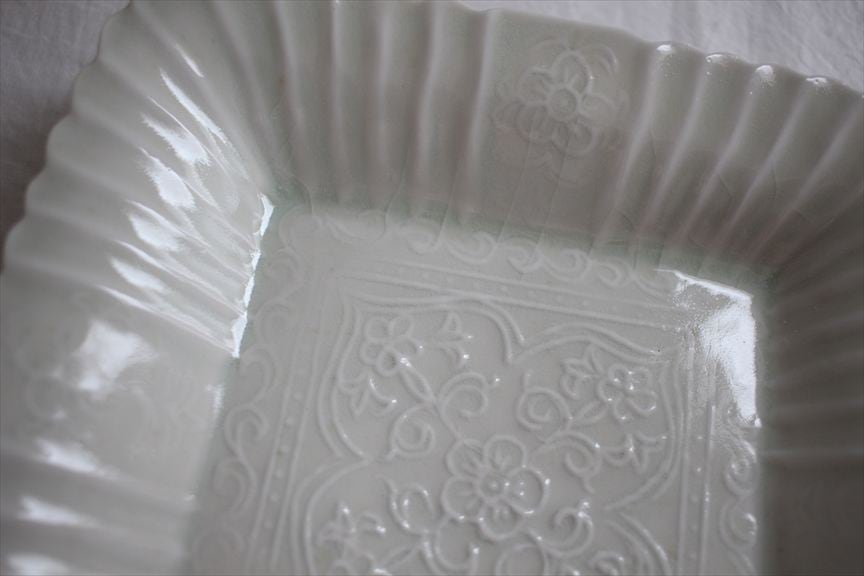 古典的な染付は淡い呉須で可愛らしい印象。また、緻密で繊細なイッチン模様やうつわを縁取る細密な型押しの作品はアンティークレースのように清楚な華やぎ。