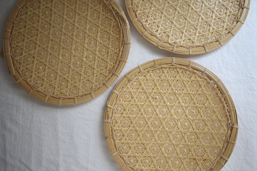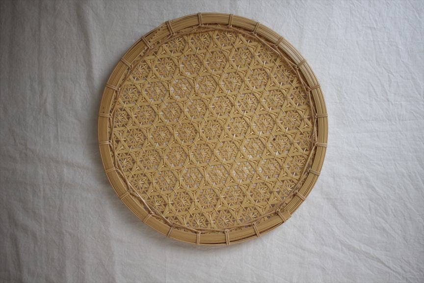 細い竹を手で編んで、美しい模様を浮かび上がらせた作品は、実用性と芸術性を併せ持ちます。