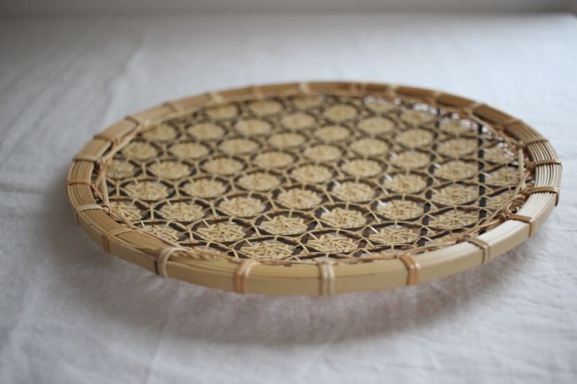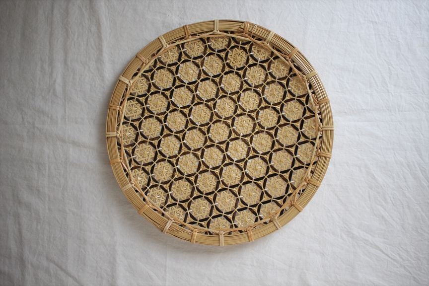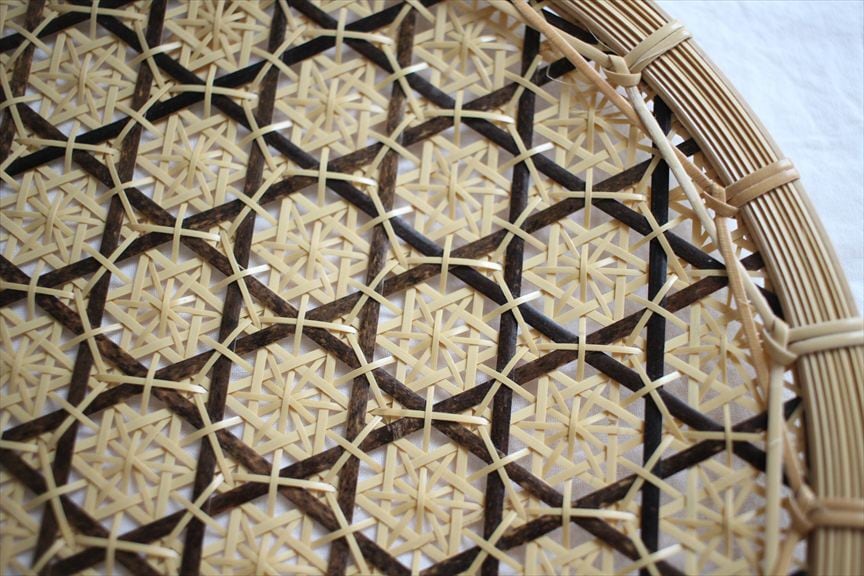 細い竹を手で編んで、美しい模様を浮かび上がらせた作品は、実用性と芸術性を併せ持ちます。