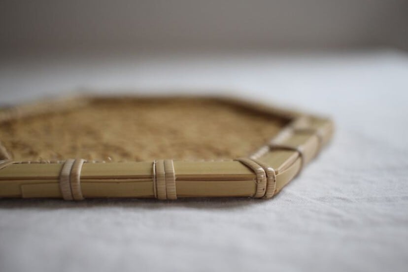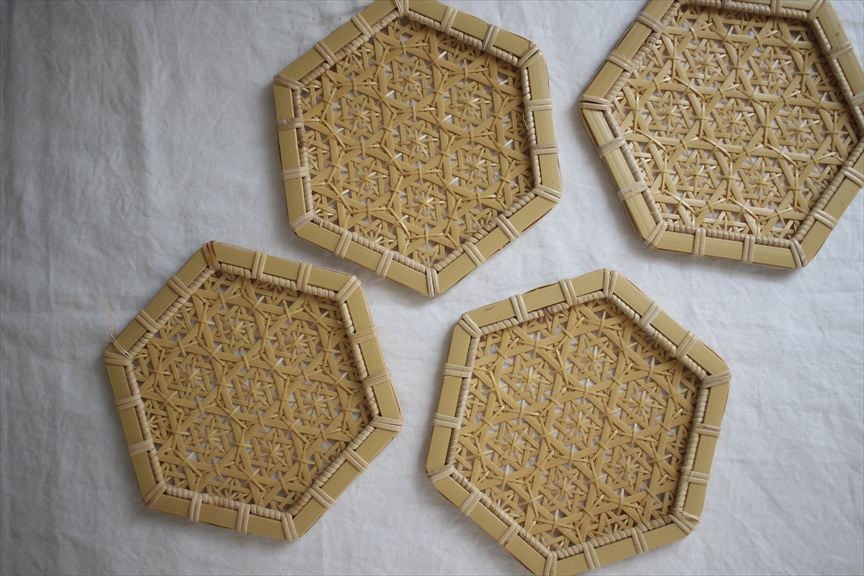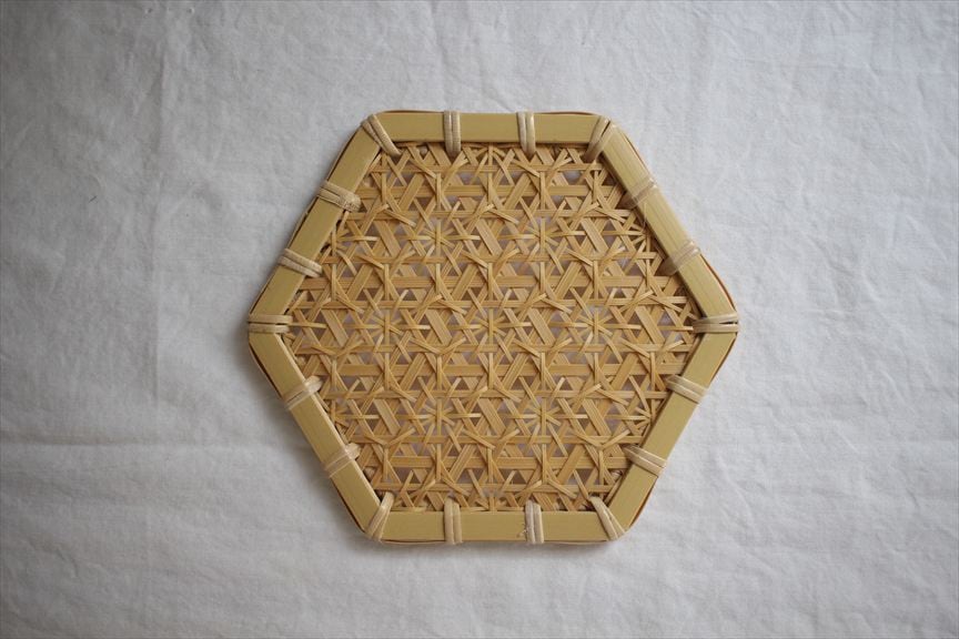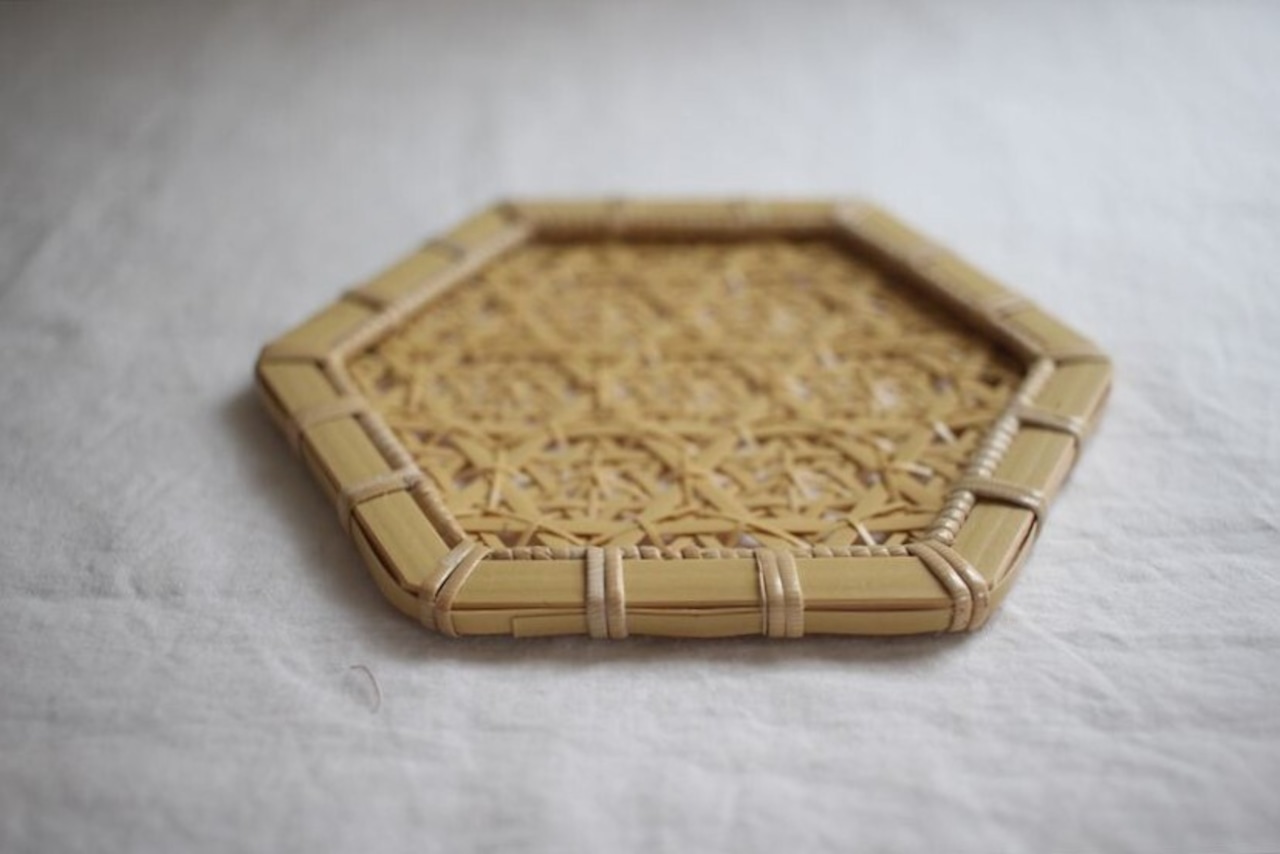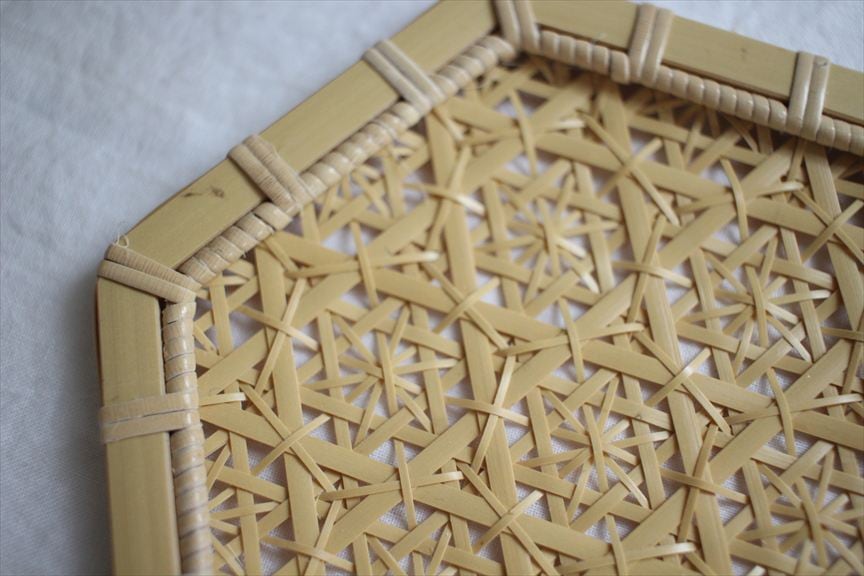 細い竹を手で編んで、美しい模様を浮かび上がらせた作品は、実用性と芸術性を併せ持ちます。