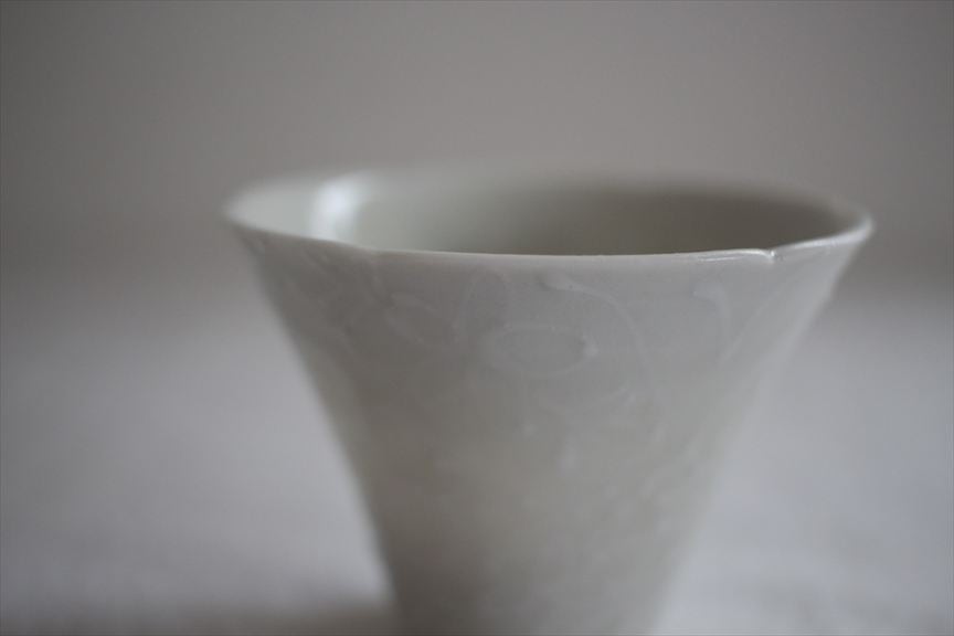古典的な染付は淡い呉須で可愛らしい印象。また、緻密で繊細なイッチン模様やうつわを縁取る細密な型押しの作品はアンティークレースのように清楚な華やぎ。