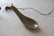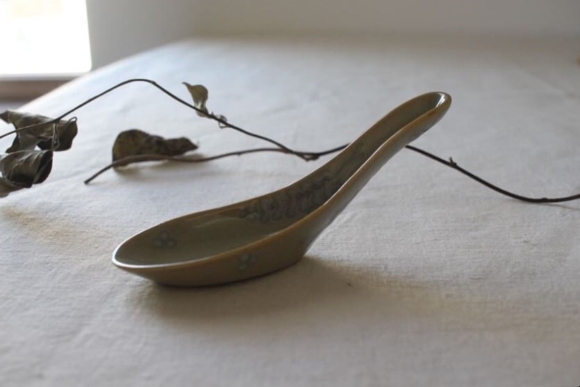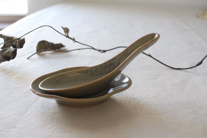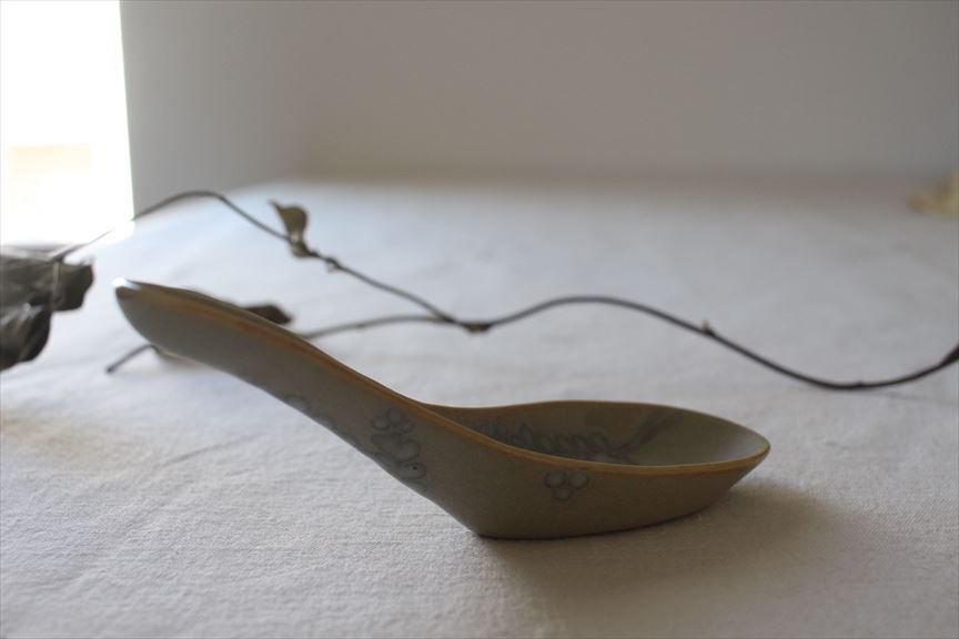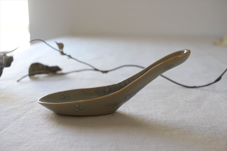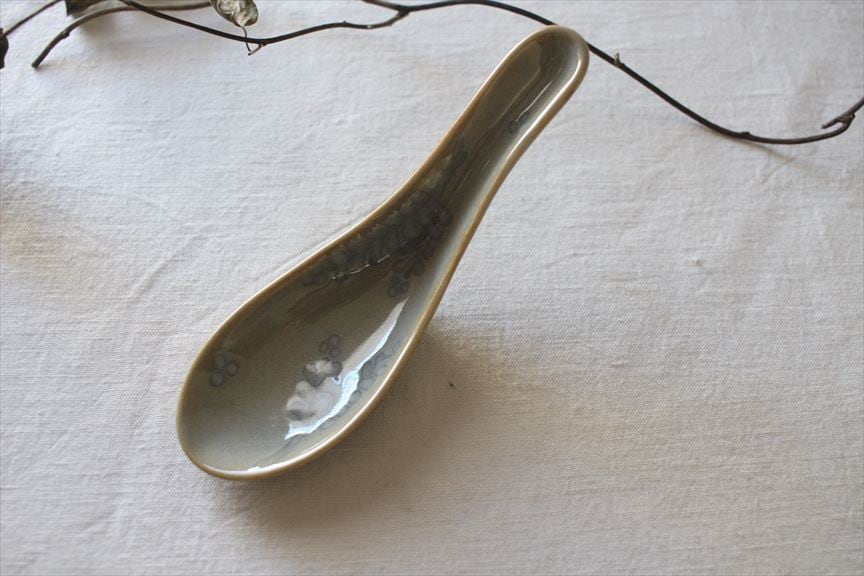 光沢のある柔らかな薄墨の手に馴染むレンゲです。風にそよぐような可愛らしいイッチン模様に目を奪われます。