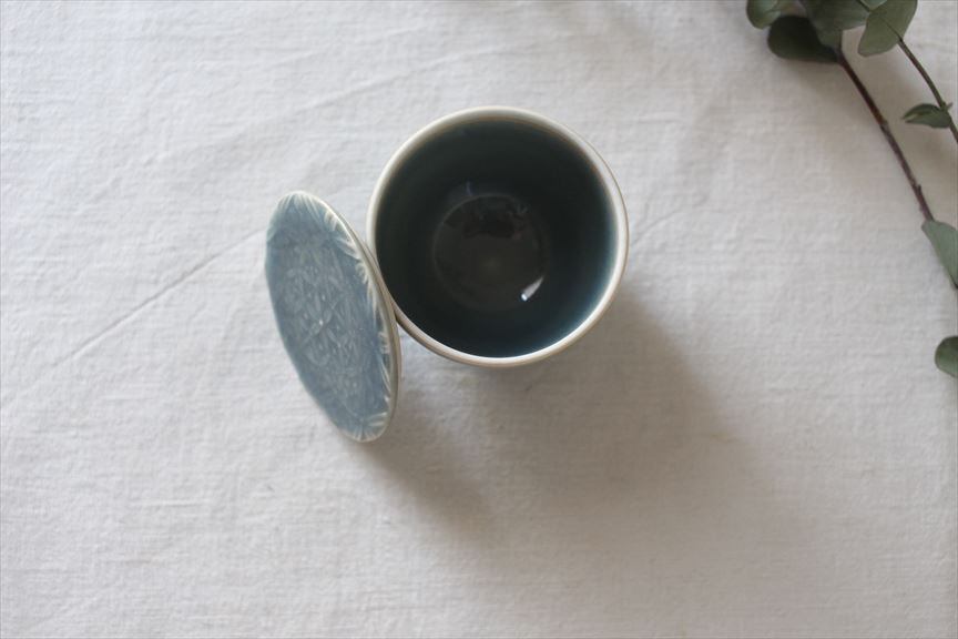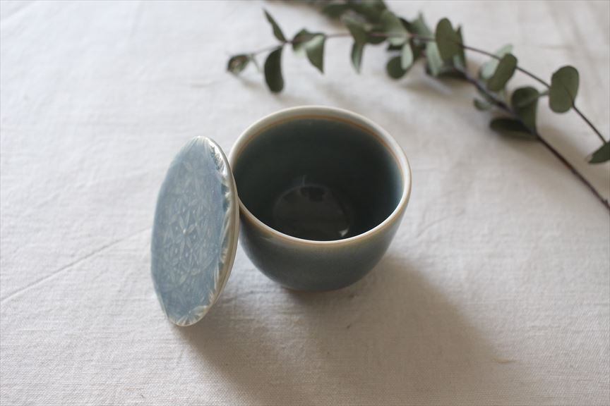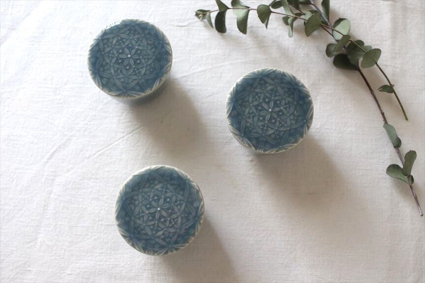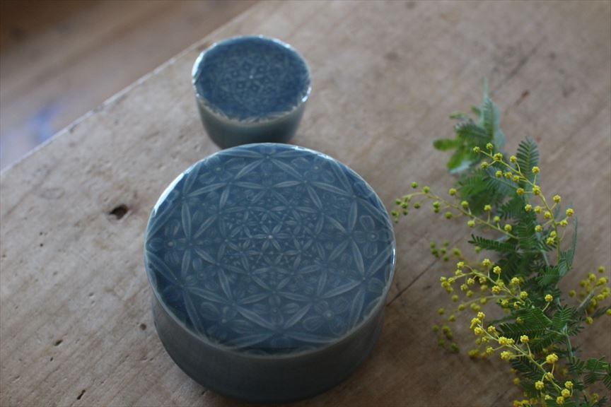 立体的に浮かび上がる美しく繊細な模様の器たちは、草木染めのような落ち着いた柔らかな色をのせられてしっとりとした佇まいです。