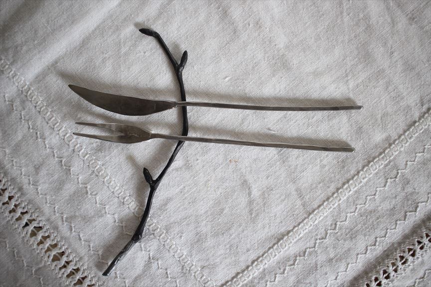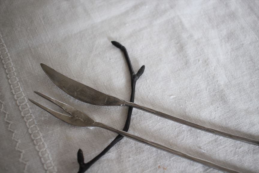 鉄で作られた大きなオブジェ、高く大きな枝を生けることのできる重い鉄の花器、一本の金属の棒をただ叩いて叩いて伸ばし広げ、カトラリーに仕上げたぬくもりのある素朴な作品など、