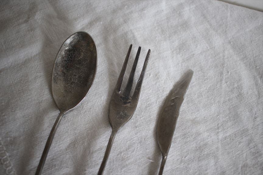 こちらのカトラリーは打ち出して作っている為、表面が凹凸しております、凹に錆が付着した場合は爪楊枝でこすってください。