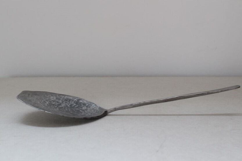 鉄で作られた大きなオブジェ、高く大きな枝を生けることのできる重い鉄の花器、一本の金属の棒をただ叩いて叩いて伸ばし広げ、カトラリーに仕上げたぬくもりのある素朴な作品など、