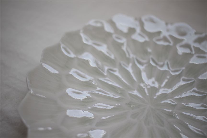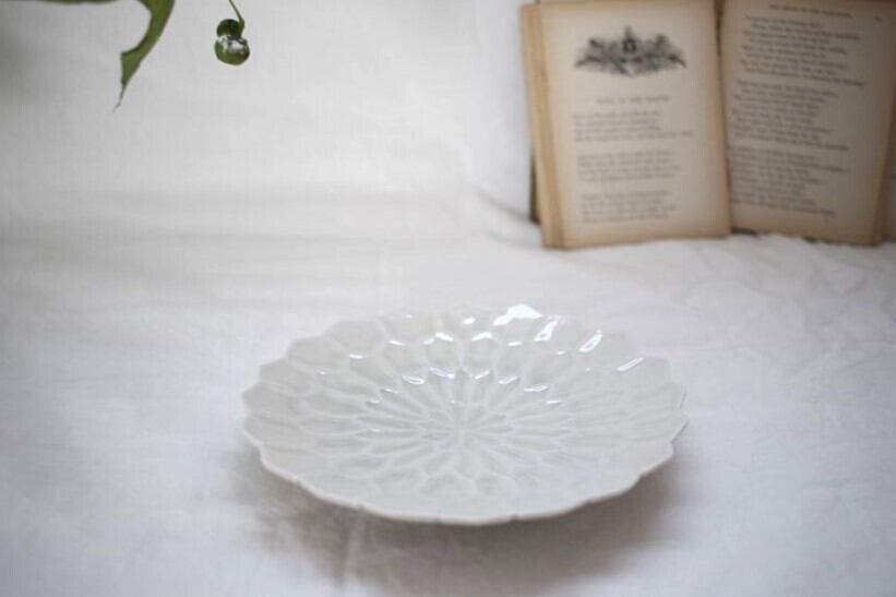 古典的な染付は淡い呉須で可愛らしい印象。また、緻密で繊細なイッチン模様やうつわを縁取る細密な型押しの作品はアンティークレースのように清楚な華やぎ。