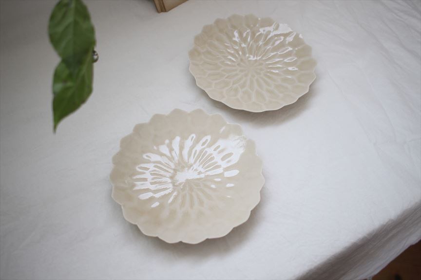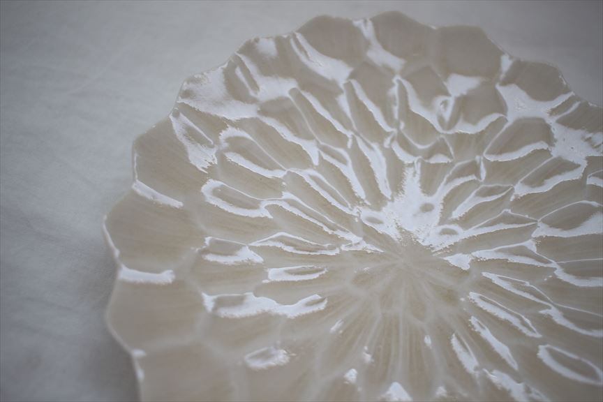 古典的な染付は淡い呉須で可愛らしい印象。また、緻密で繊細なイッチン模様やうつわを縁取る細密な型押しの作品はアンティークレースのように清楚な華やぎ。
