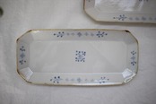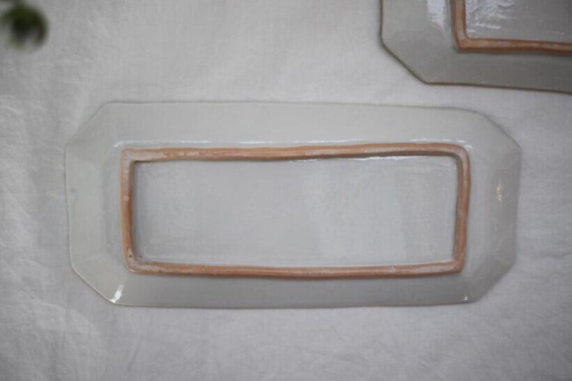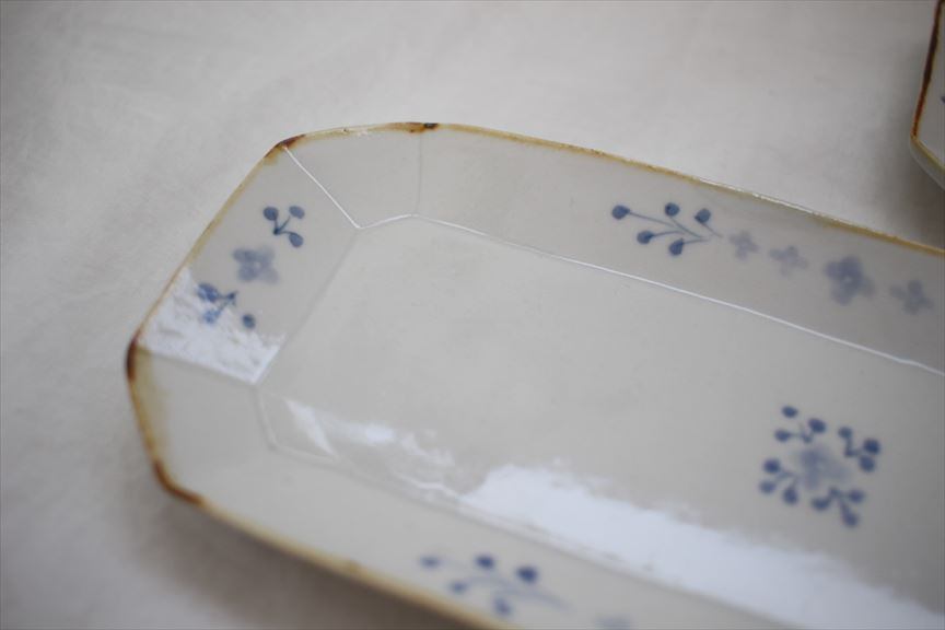 古典的な染付は淡い呉須で可愛らしい印象。また、緻密で繊細なイッチン模様やうつわを縁取る細密な型押しの作品はアンティークレースのように清楚な華やぎ。