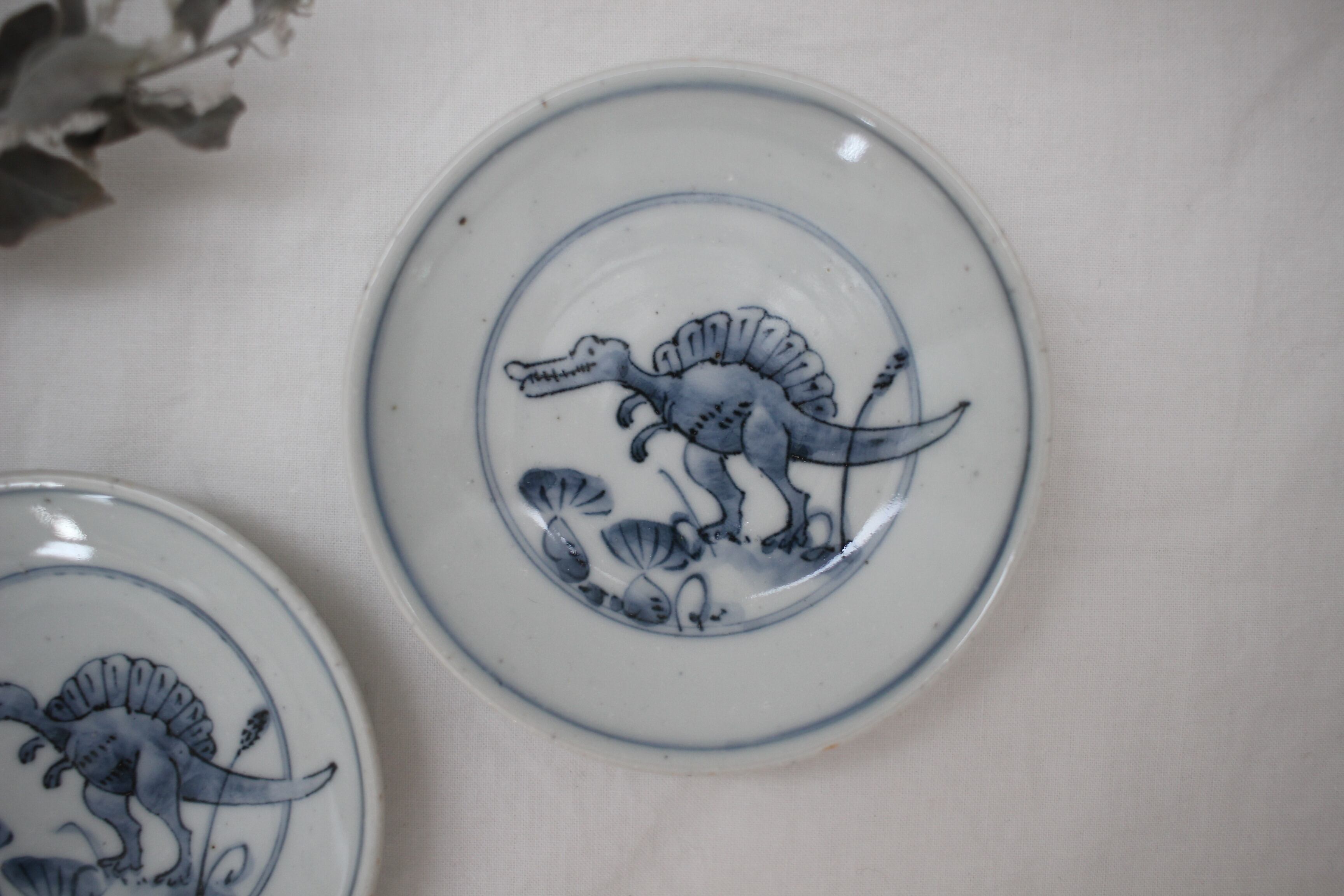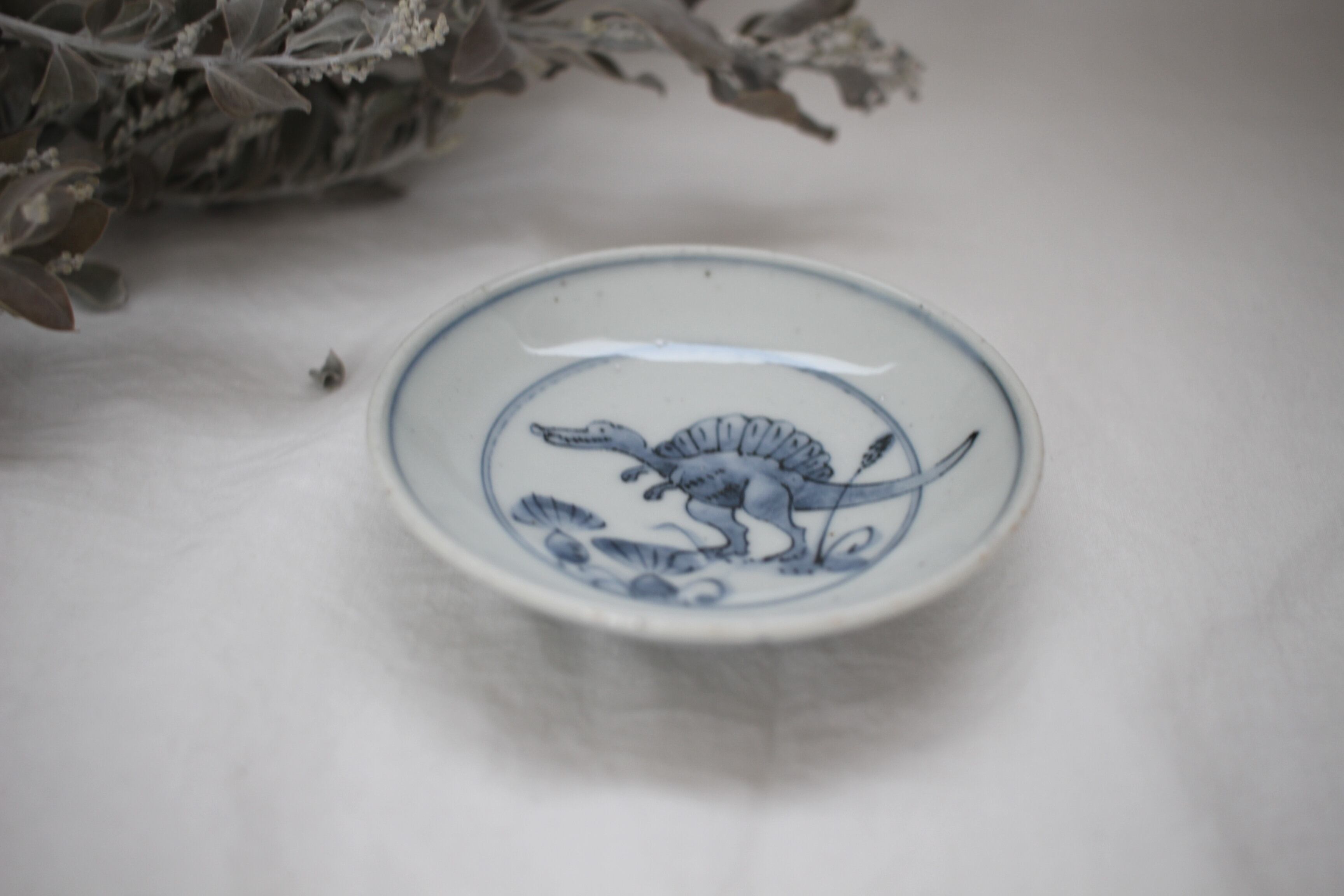 古伊万里のような優し気で柔らかな古典柄の豆皿のようですが、絵柄は可愛い恐竜です。