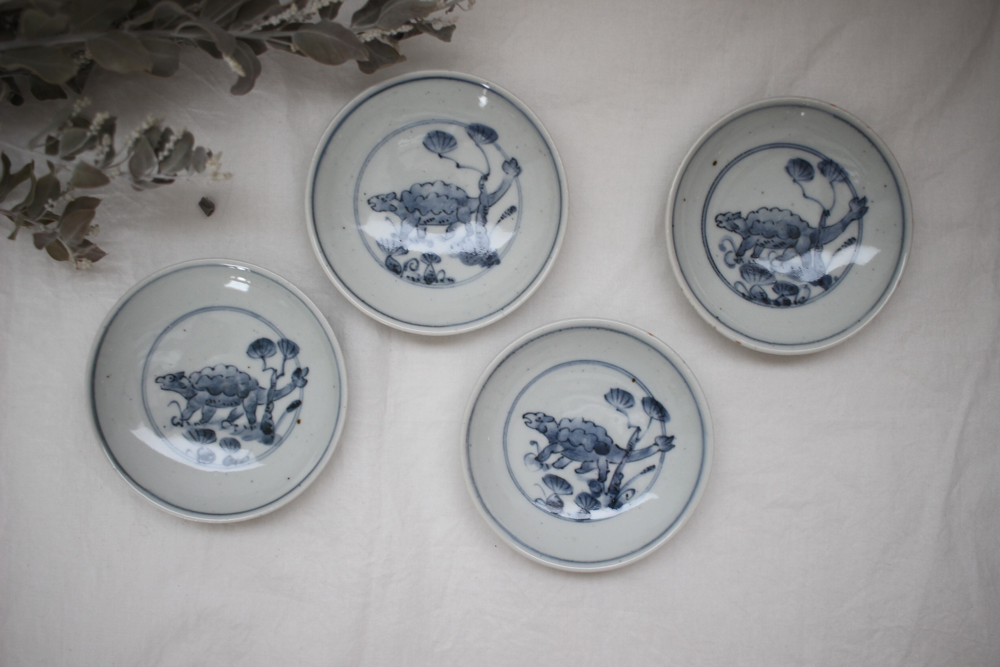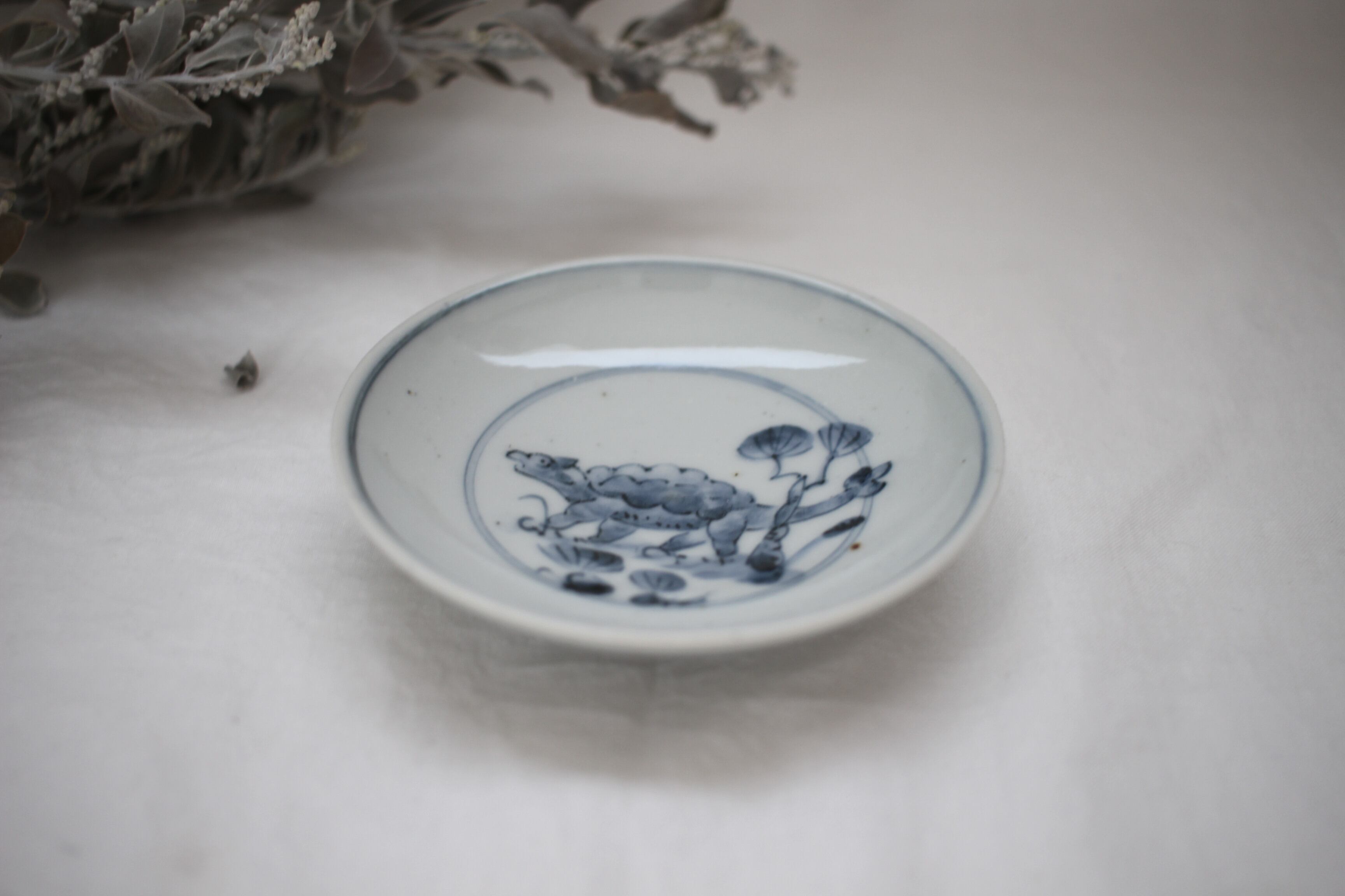 古伊万里のような優し気で柔らかなな古典柄の豆皿のようですが、絵柄は可愛い恐竜です。