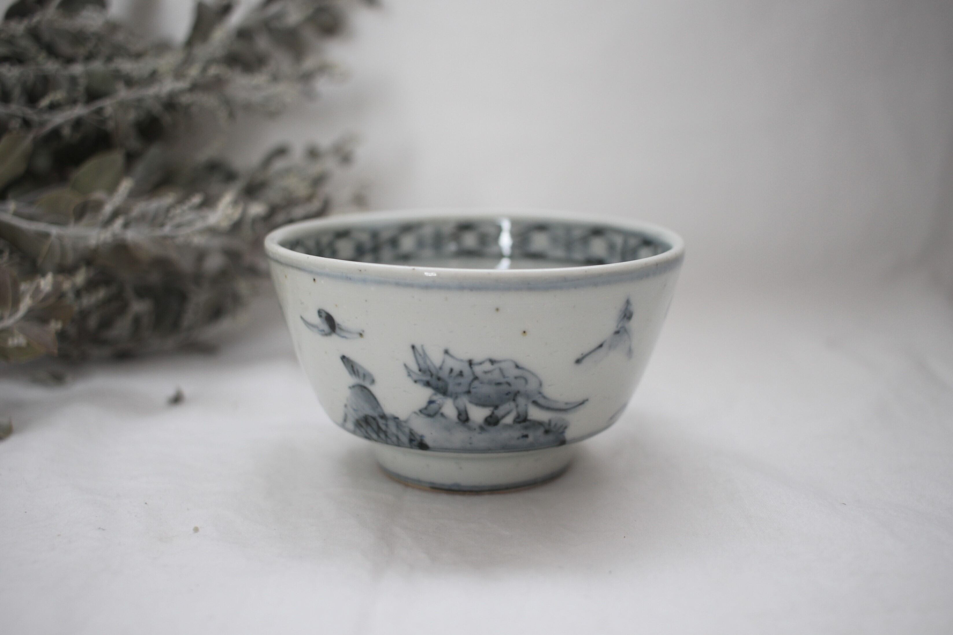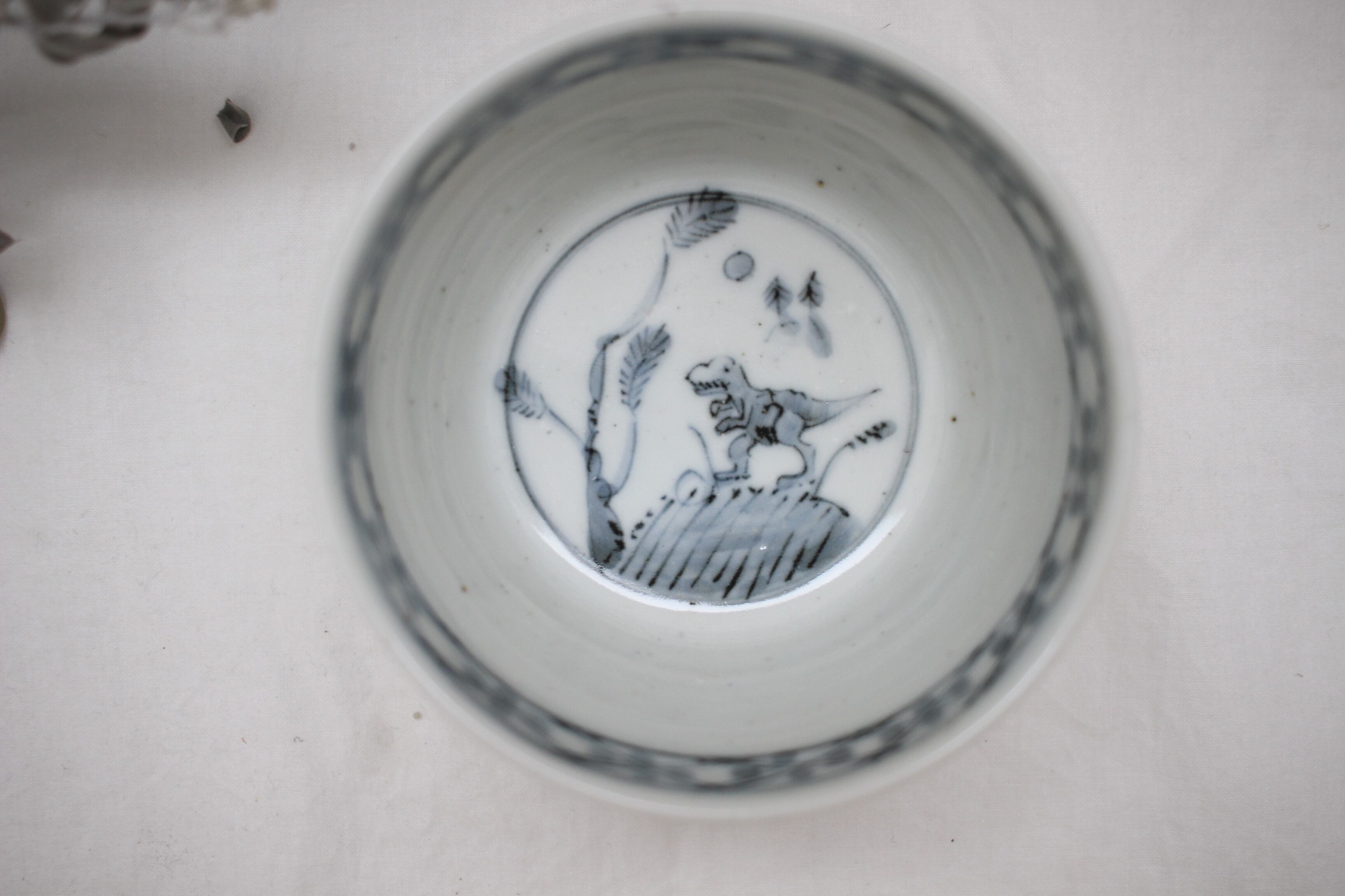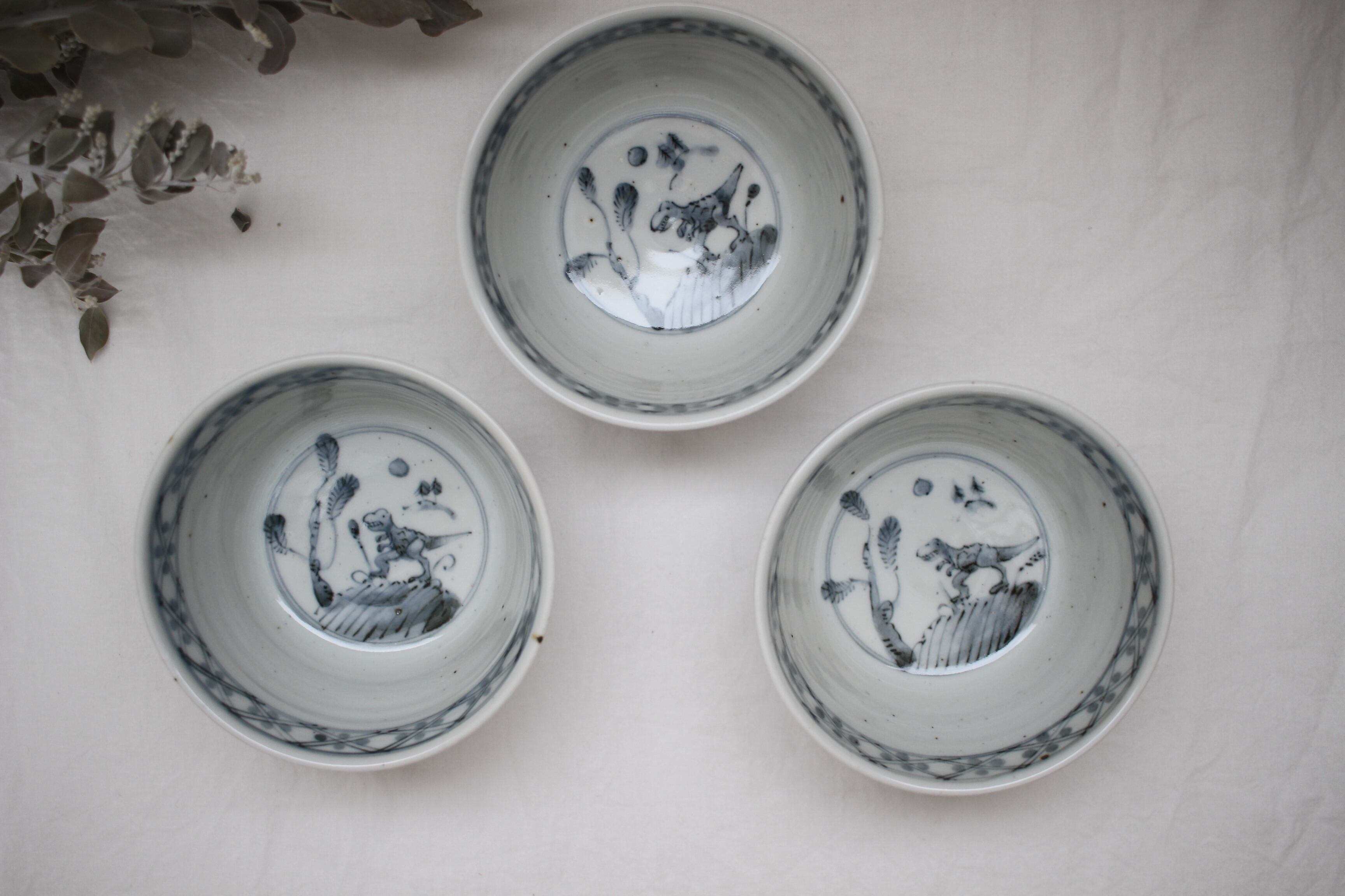 古伊万里のような優し気な古典柄のようですが、絵柄は可愛い恐竜です。ティラノサウルスとトリケラトプス、見込みにはティラノサウルスが描かれています。呉須の濃淡、繊細なタッチで今にも動き出しそうな恐竜。