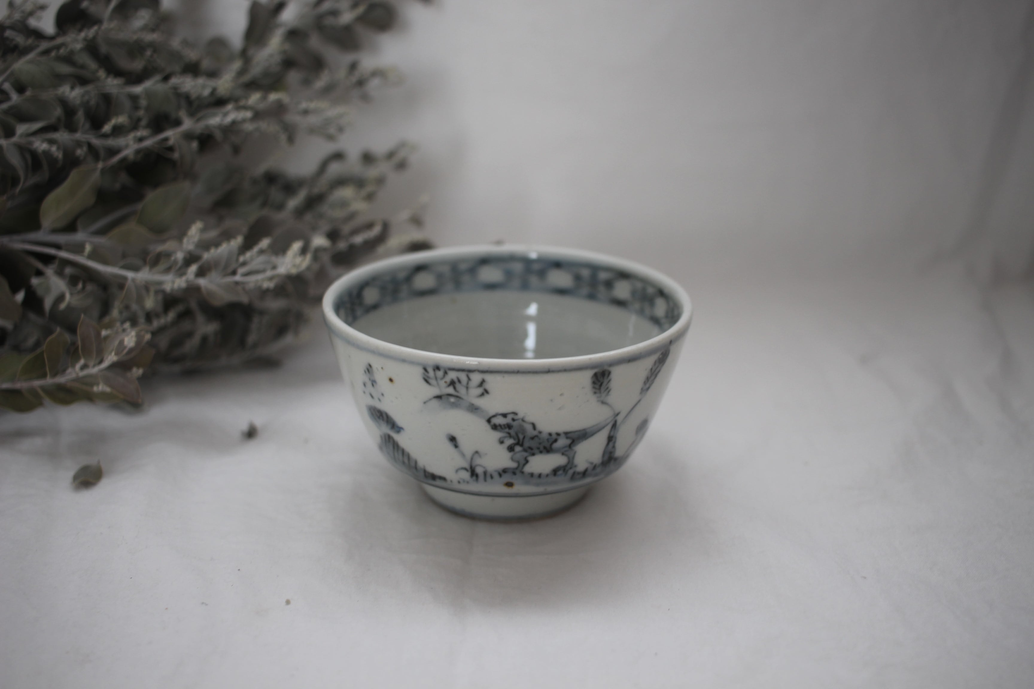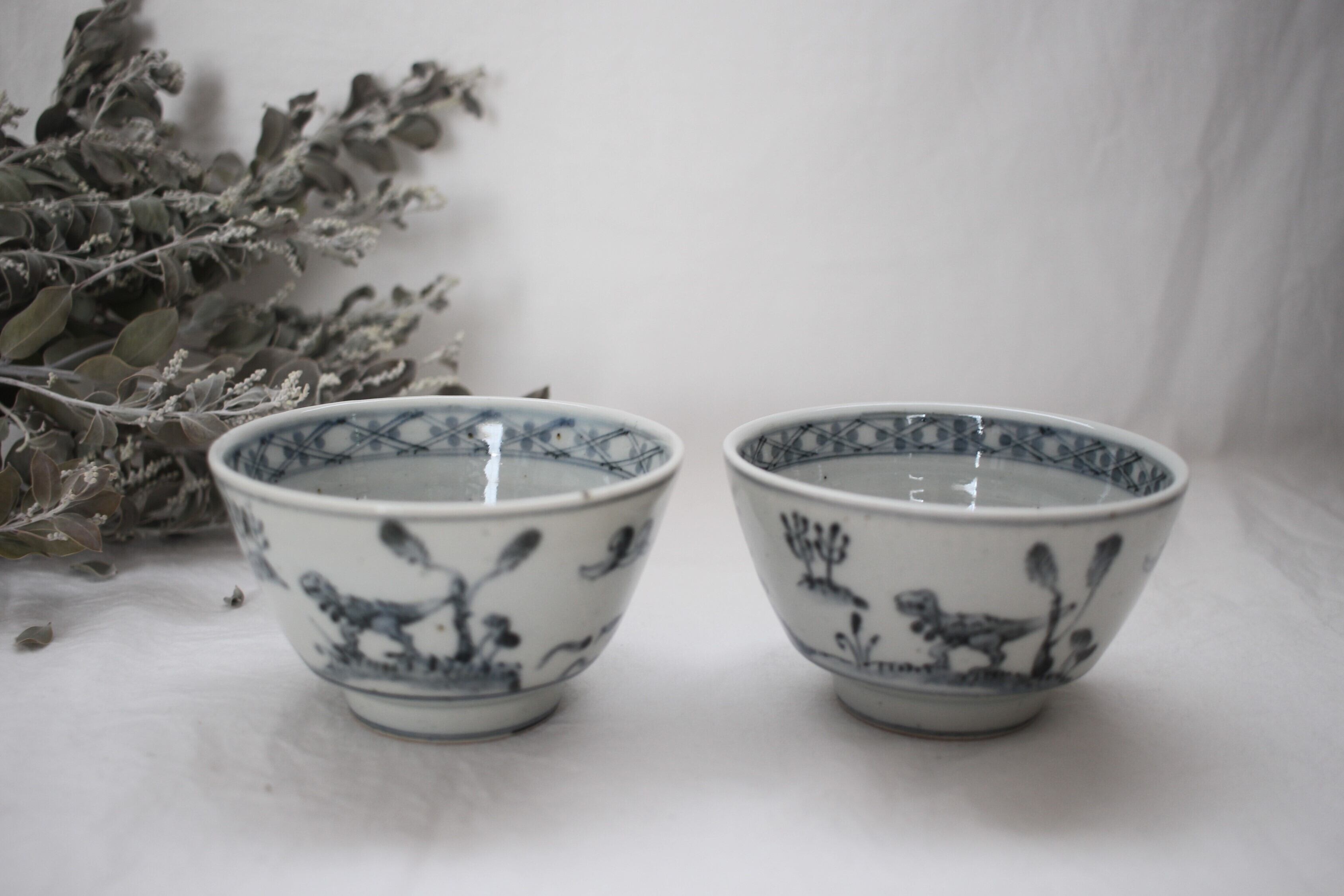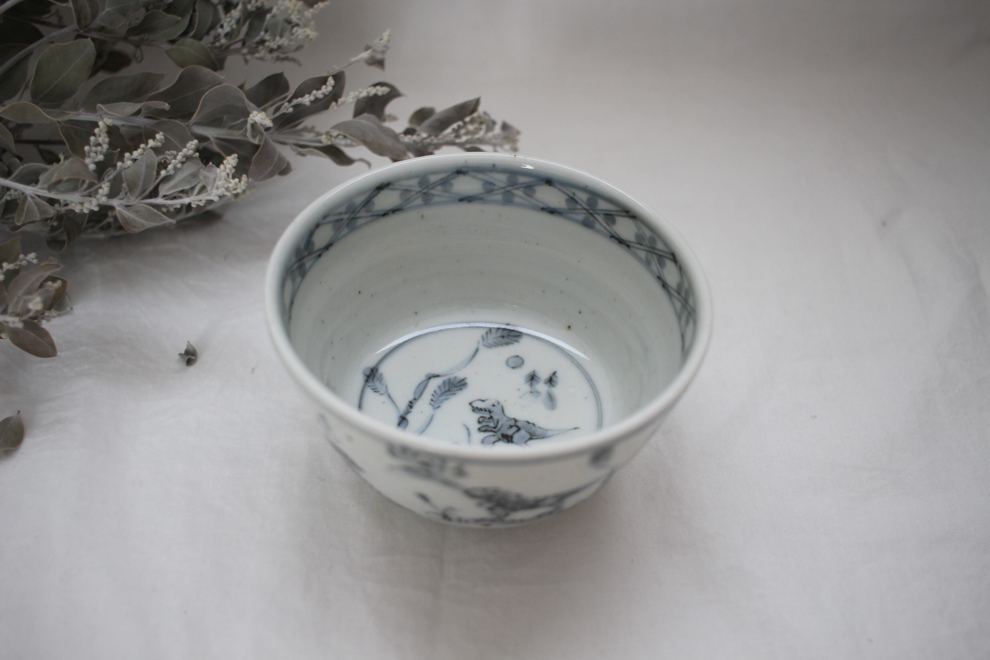 古伊万里のような優し気な古典柄のようですが、絵柄は可愛い恐竜です。ティラノサウルスとトリケラトプス、見込みにはティラノサウルスが描かれています。呉須の濃淡、繊細なタッチで今にも動き出しそうな恐竜。