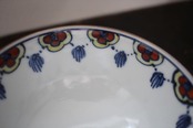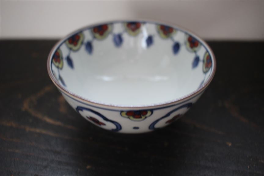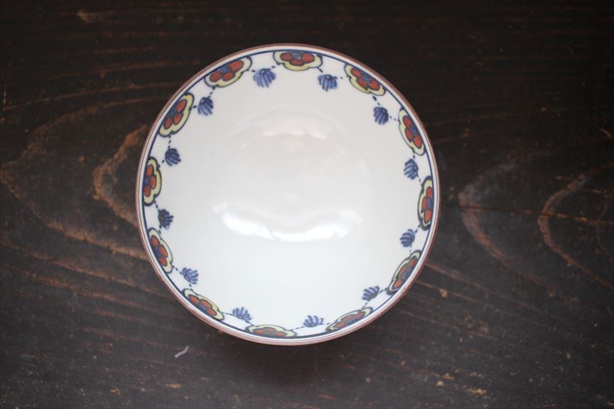 トリコロールが印象的。リズミカルな木瓜と四葉の花が可愛らしい飯碗。