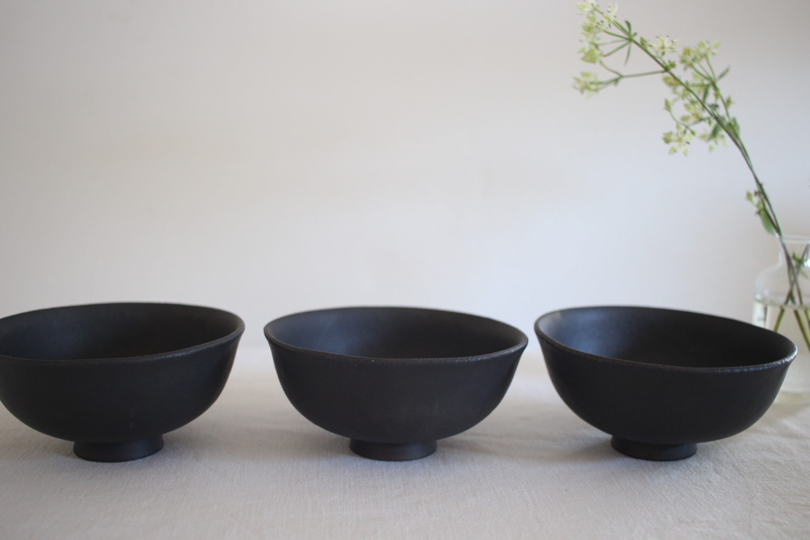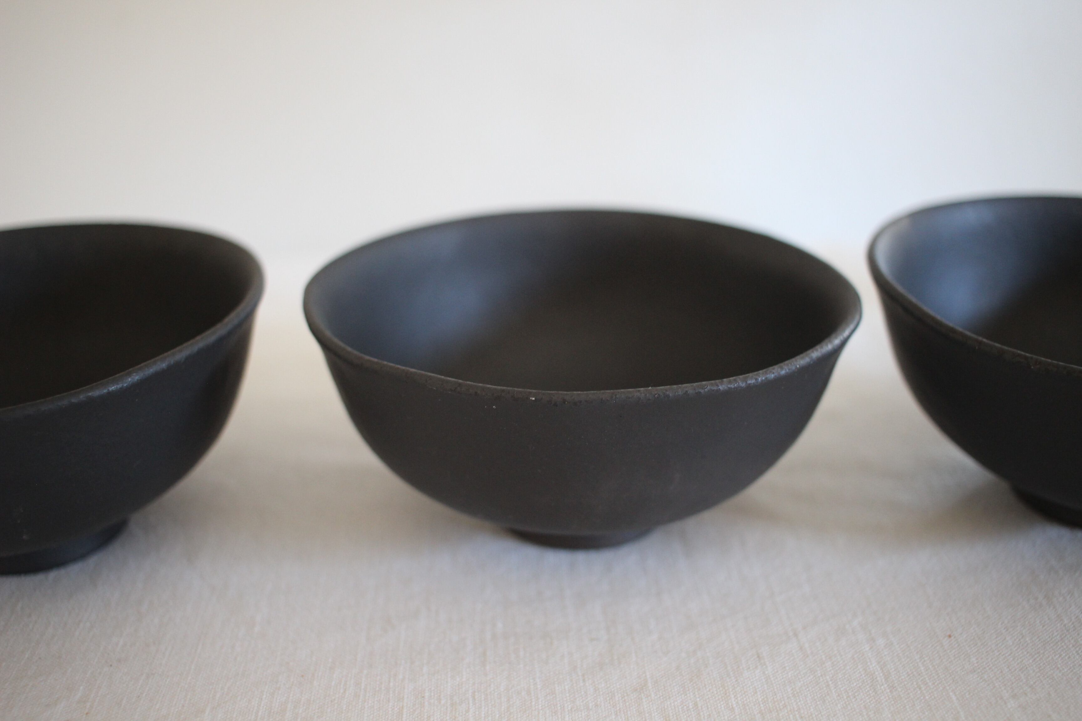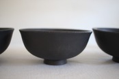 いぶした金を覆うような深遠な黒、洗練されたスタイル、軽さ、安定のスタッキング、触れた手に伝わる土のぬくもり、作品の一つ一つが持つ自然なゆらぎ。