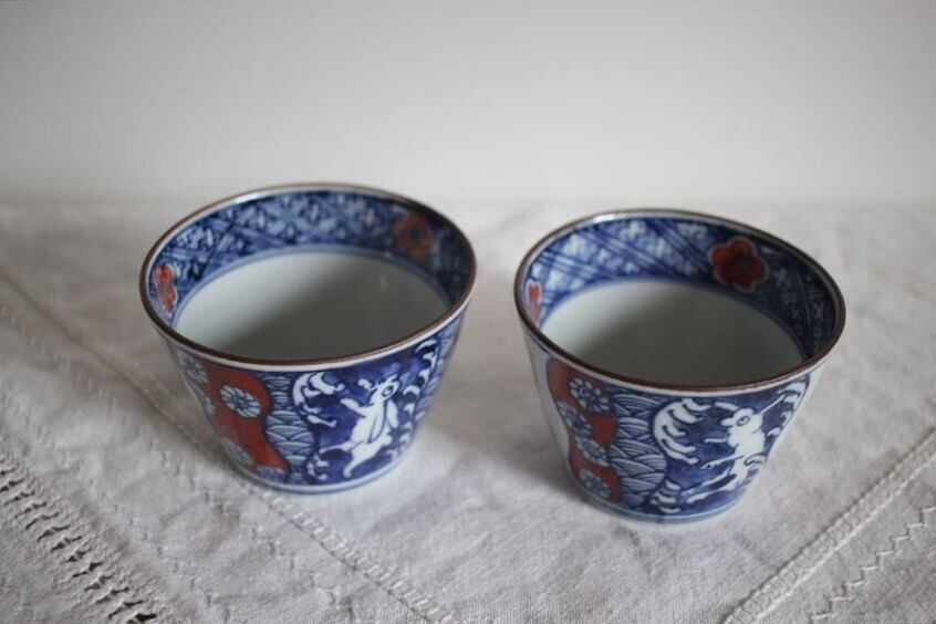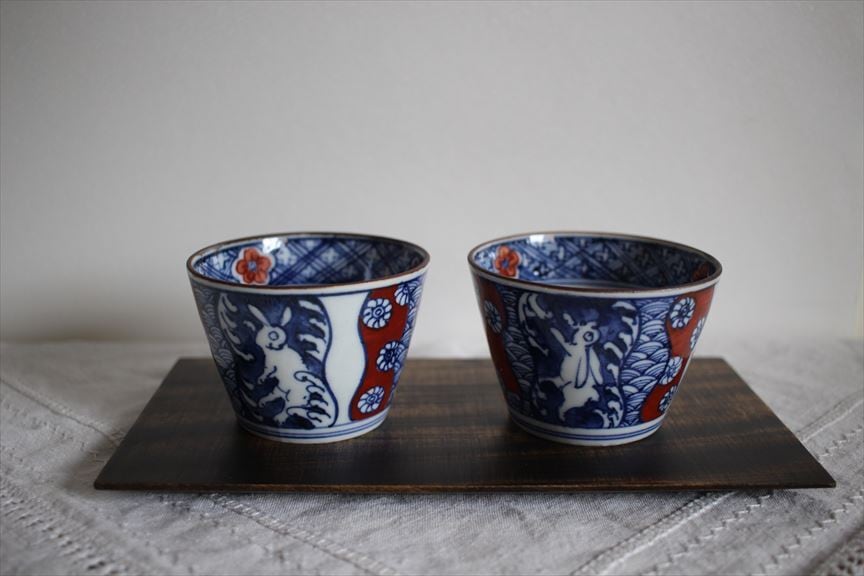 あでやかで可愛らしく上品な正統派。美しい赤の発色とみずみずしい呉須の青のコントラスト。生き生きと描かれたうさぎがリズミカルに器を囲む文様。